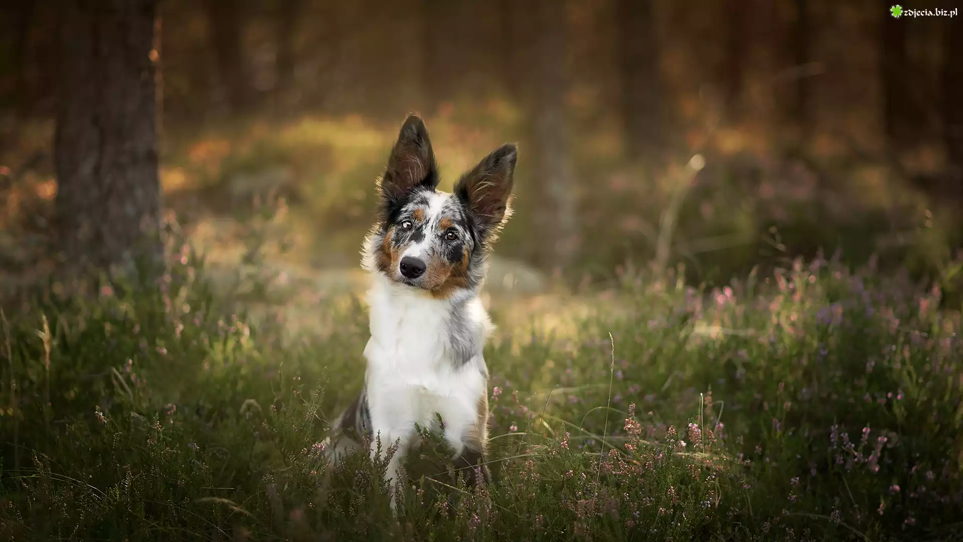 Zdjęcie Pies, Border collie, Drzewa, Wrzos