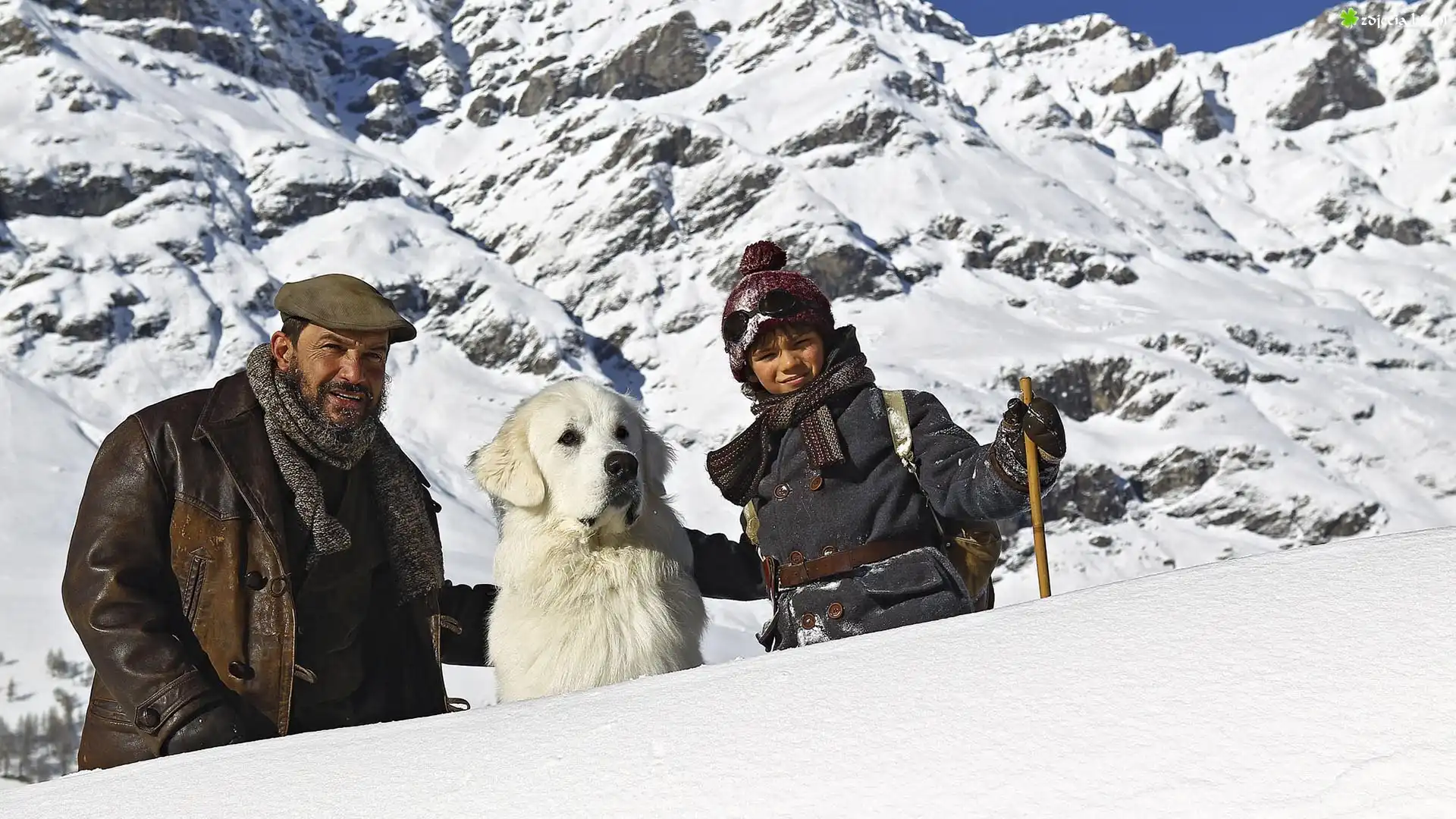 Zdjęcie Film, Bella i Sebastian, Pirenejski pies górski, Góry, Alpy, Zima Dziecko, Mężczyzna