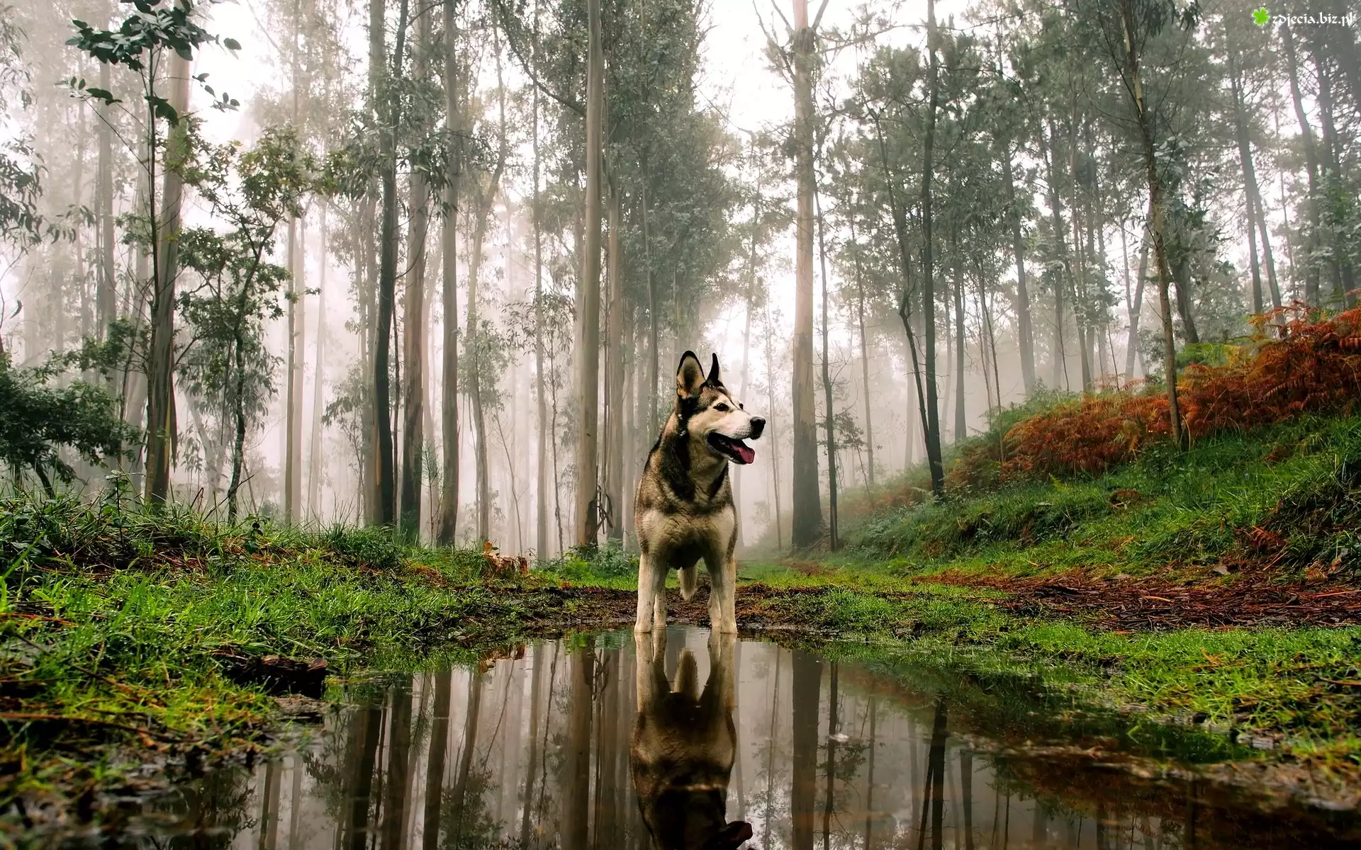 Zdjęcie Pies, Alaskan Malamute, Las, Jesień, Kałuża