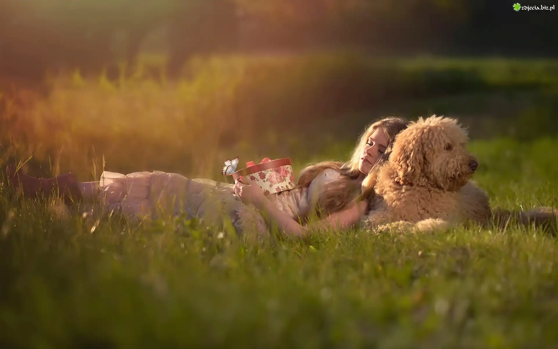 Zdjęcie Kobieta, Pies, Labradoodle, Łąka, Trawa, Prezent, Trawa