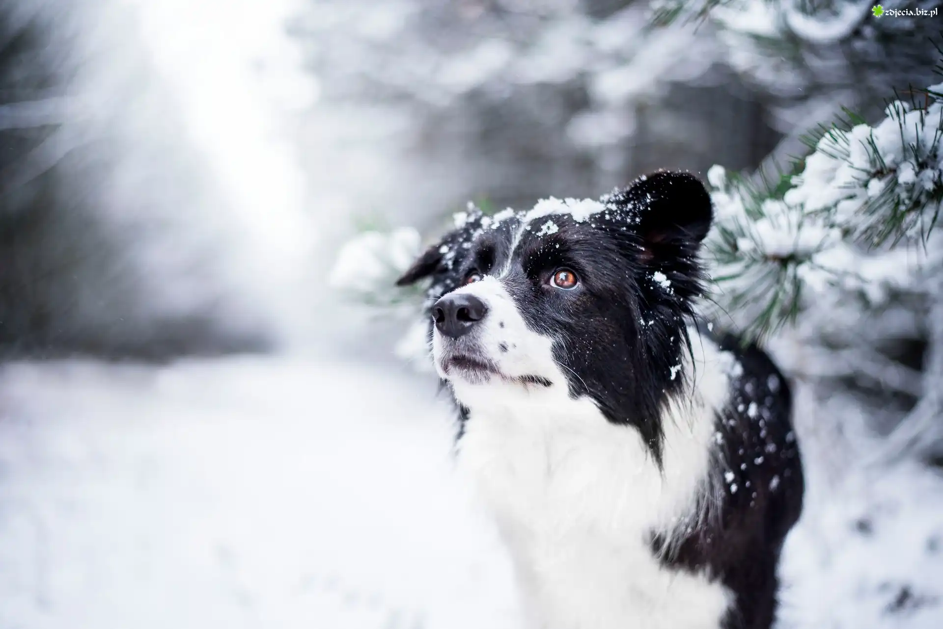 Zdjęcie, Pies, Border collie, Zima, Śnieg, Gałązki