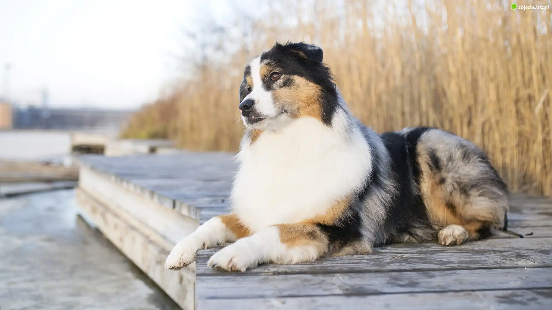 Zdjęcie Pies, Owczarek australijski, Pomost, Trawy, Woda