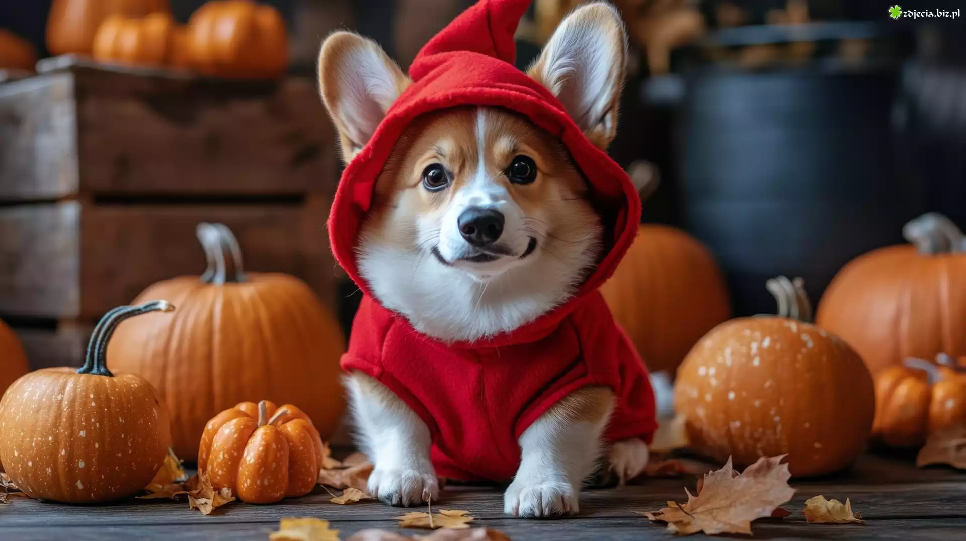 Zdjęcie, Pies, Welsh corgi pembroke, Czapka, Czerwone, Ubranko, Dynie, AI
