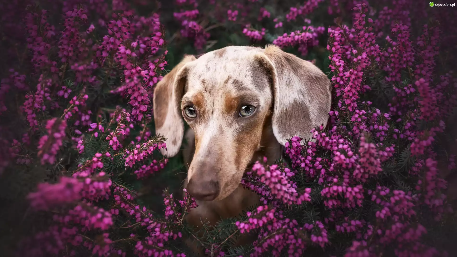 Zdjęcie, Pies, Jamnik, Wrzosy