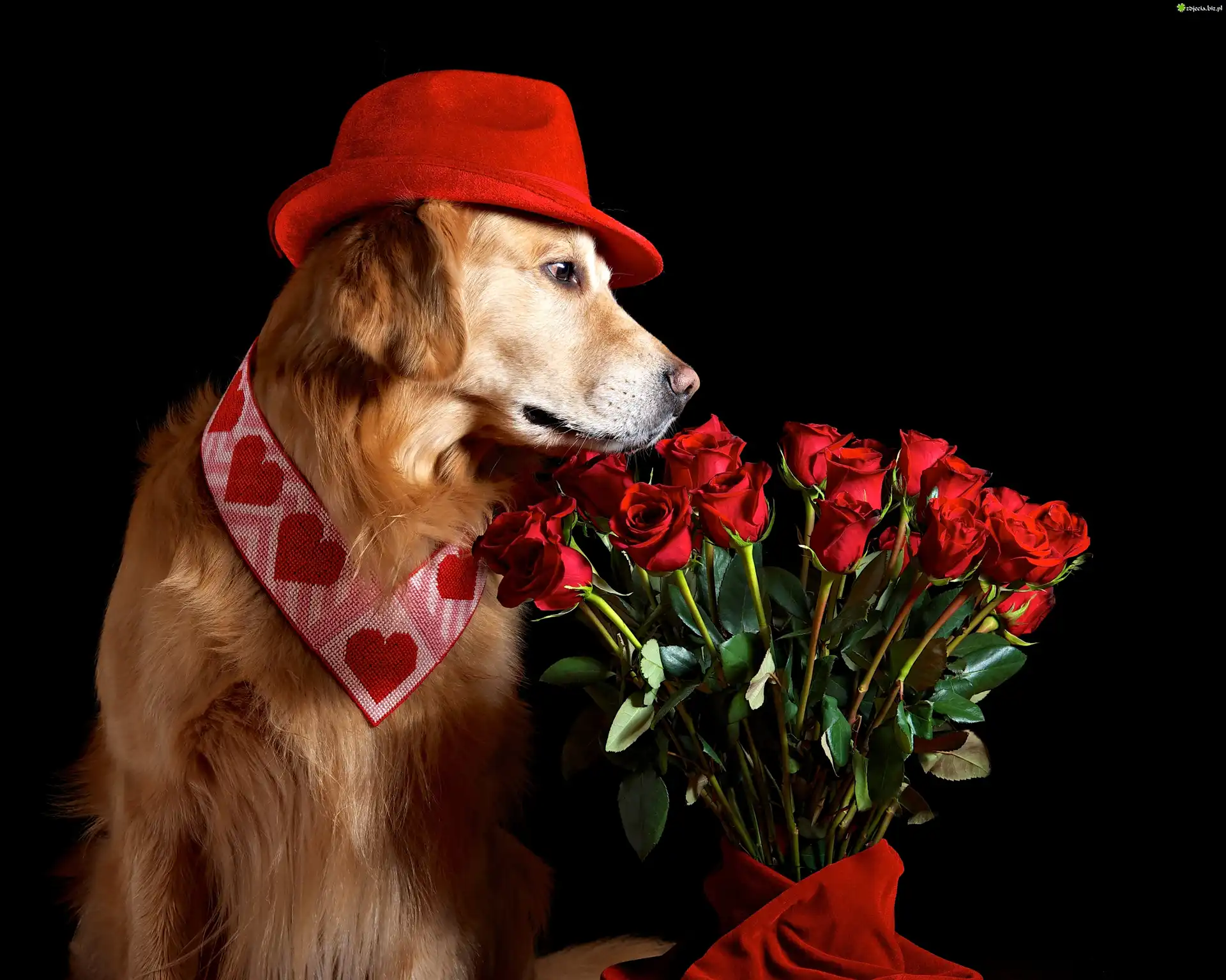 Zdjęcie Pies, Golden retriever, Kapelusz, Bukiet, Róże