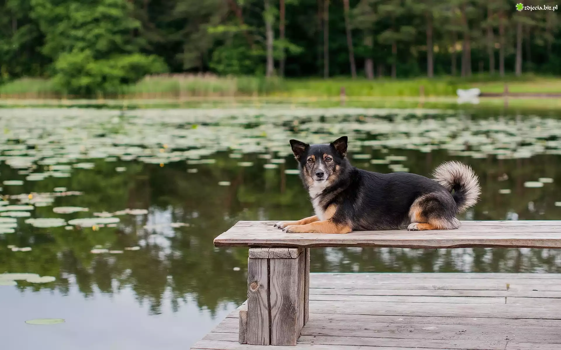 Zdjęcie Pies, Piesek, Jezioro, Staw, Pomost, Ławka, Ławeczka