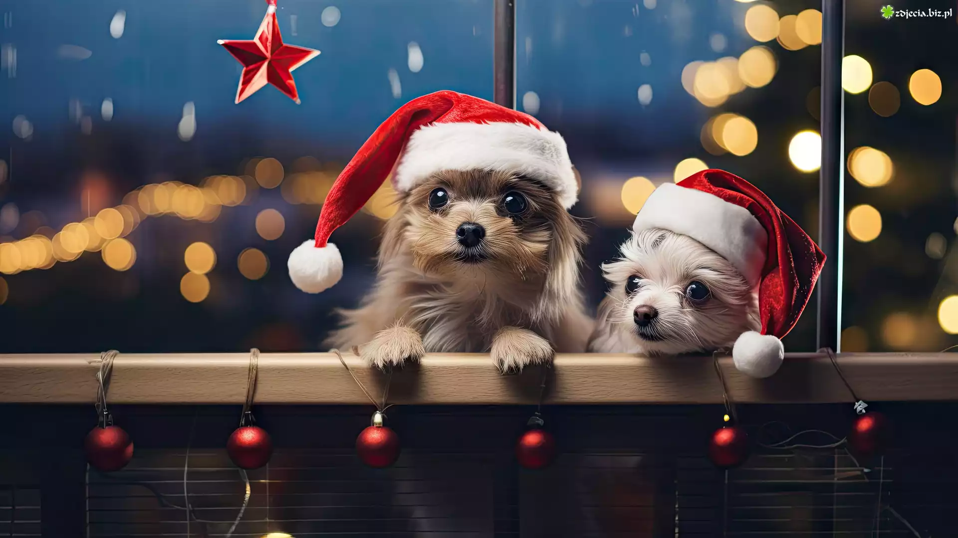 Zdjęcie Bombki, Dwa, Psy, Pieski, Czapki, Mikołaja