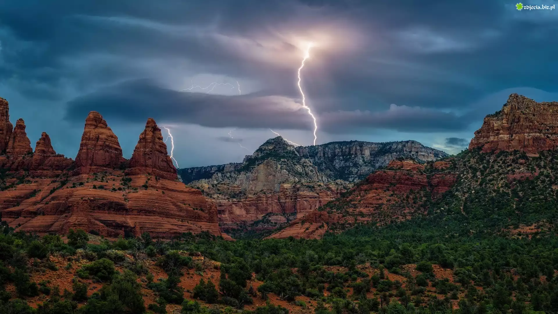 Zdjęcie Stany Zjednoczone, Arizona, Sedona, Skały, Krzewy, Burza, Piorun