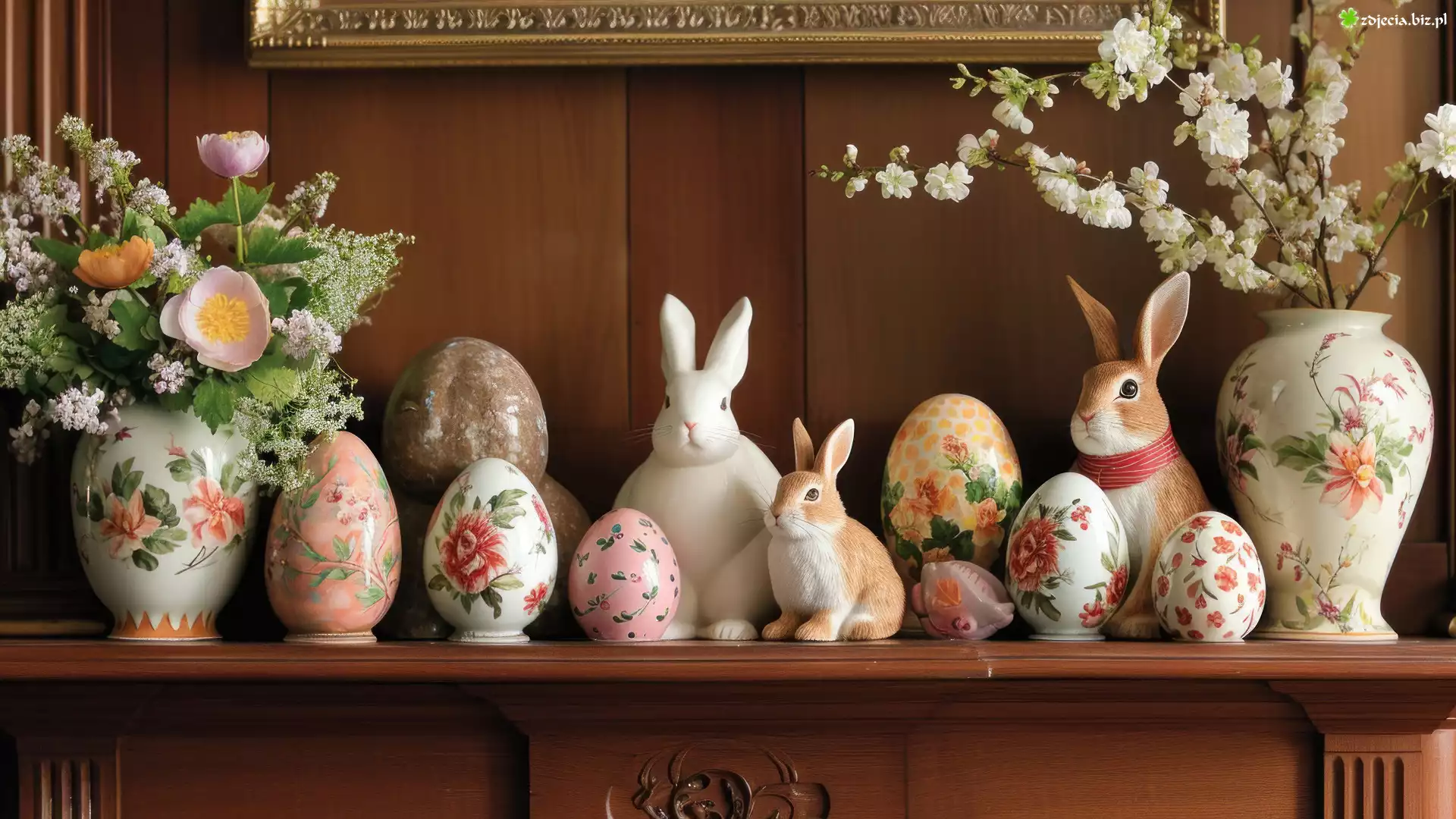 Zdjęcie Wielkanoc, Figurki, Królik, Pisanki, Wazon, Kwiaty