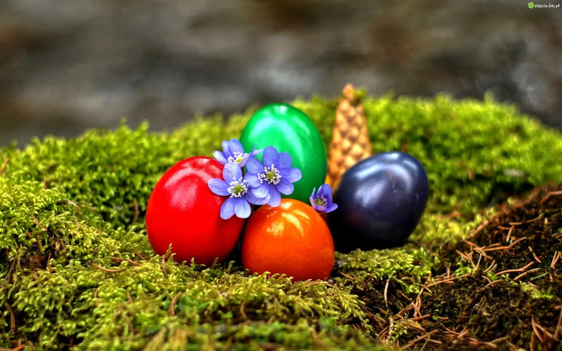Zdjęcie Pisanki, Przylaszczki, Mech, Szyszka