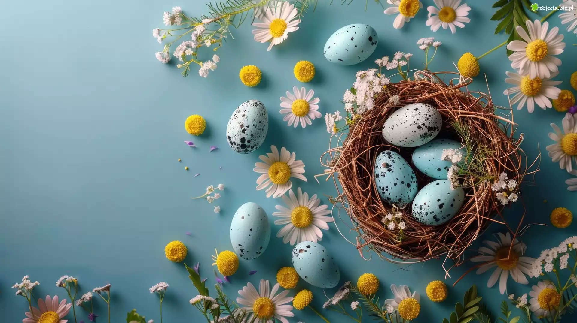 Zdjęcie Ptasie, Gniazdo, Niebieskie, Pisanki, Kwiaty, Wielkanoc, Grafika