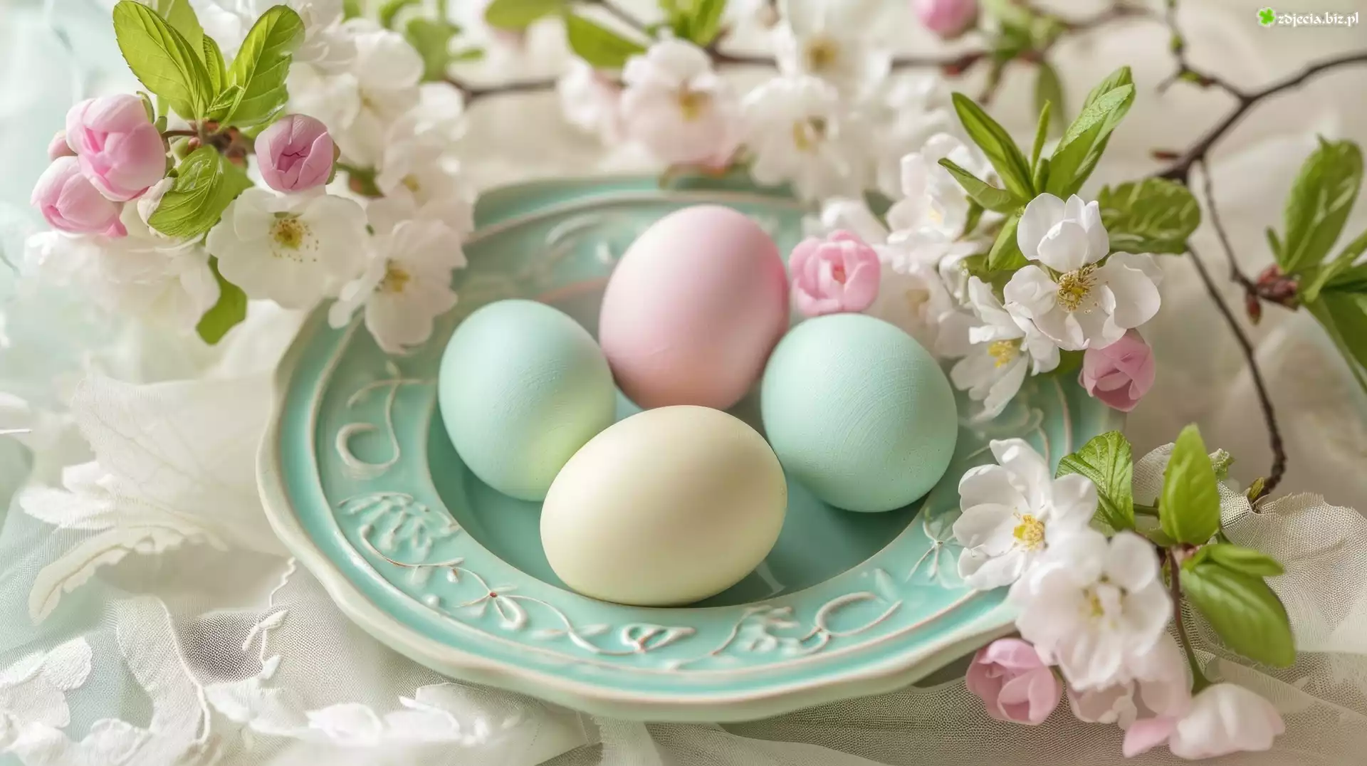 Zdjęcie Wielkanoc, Pisanki, Talerz, Kwiaty, Gałązka