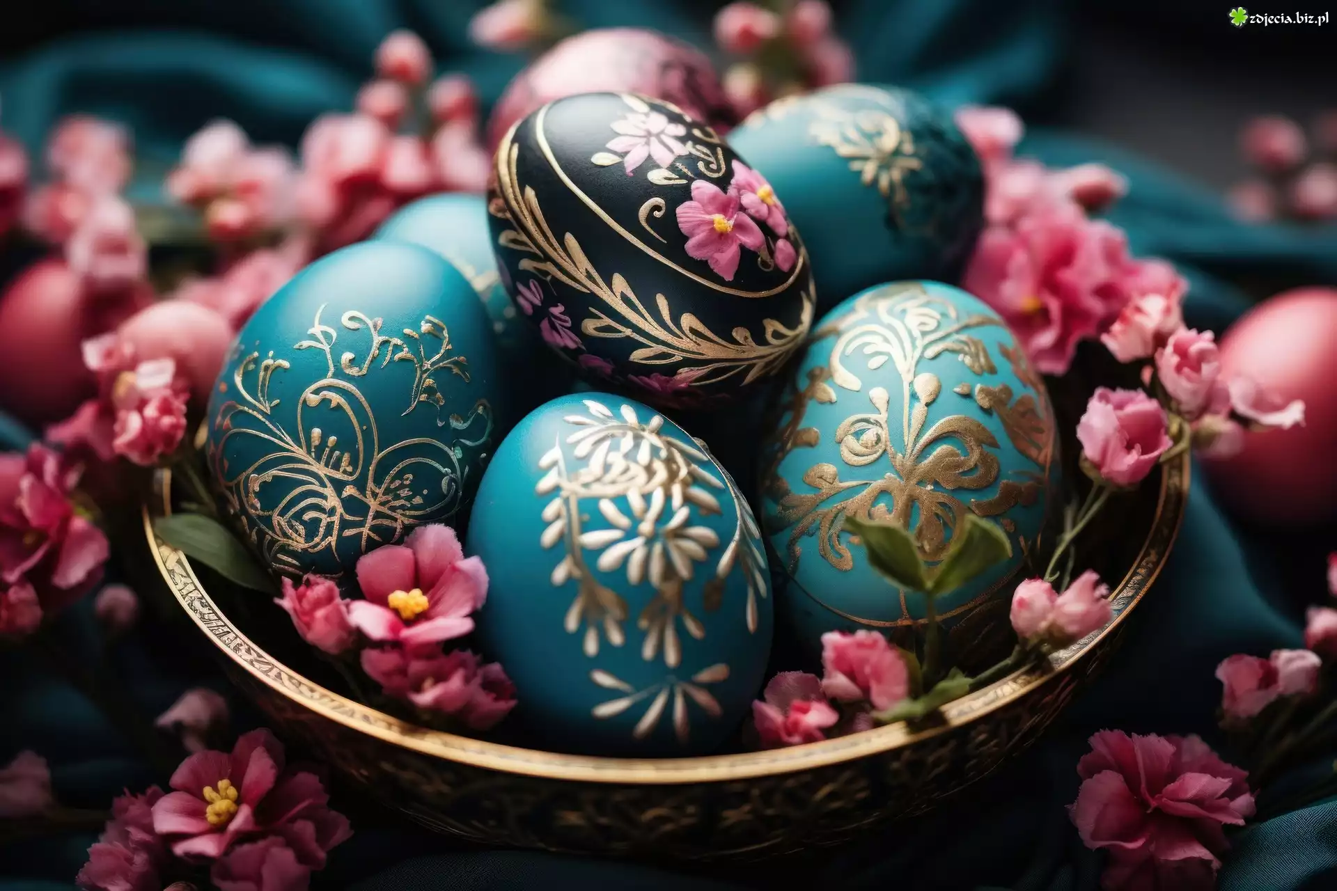 Zdjęcie, Wielkanoc, Pisanki, Talerz, Różowe, Kwiaty
