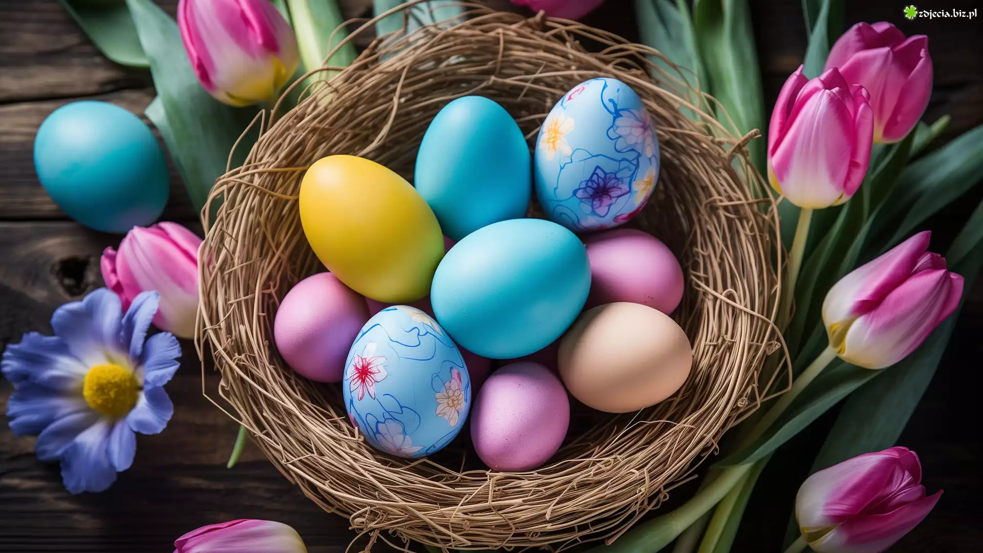 Zdjęcie Wielkanoc, Gniazdo, Kolorowe, Pisanki, Różowe, Tulipany