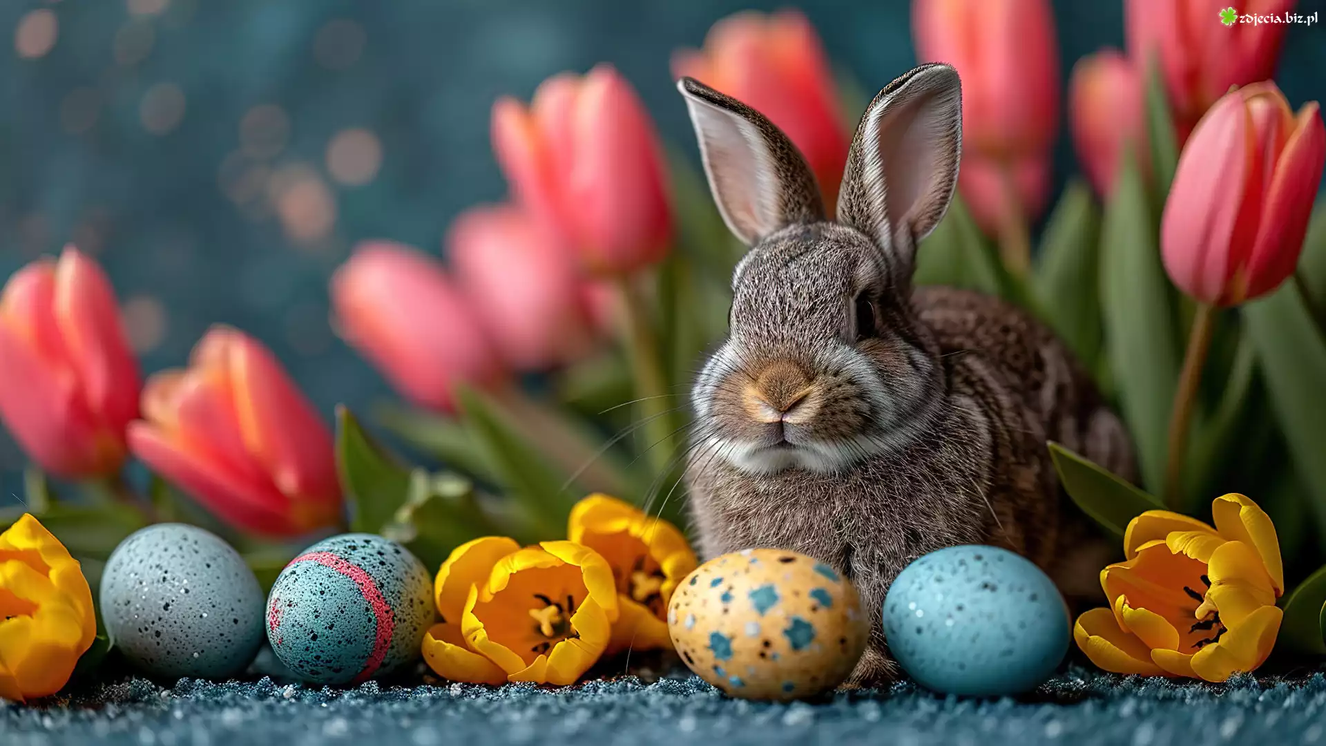 Zdjęcie Wielkanoc, Królik, Nakrapiane, Pisanki, Kolorowe, Tulipany