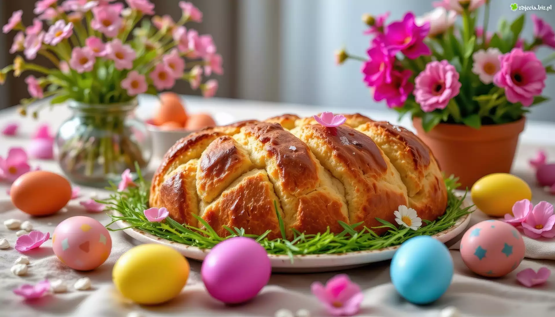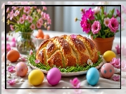 Zdjęcie Chleb, Talerz, Kolorowe, Pisanki, Kwiaty, Wielkanoc