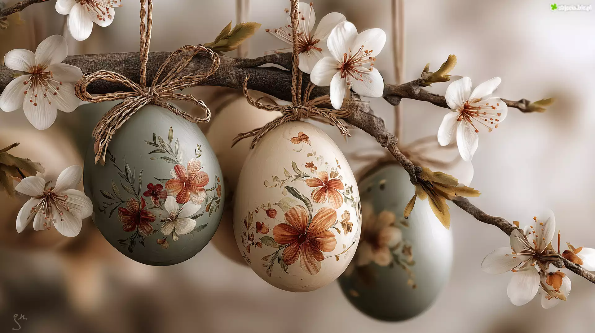 Zdjęcie, Pisanki, Gałązka, Białe, Kwiaty, Styl, Rustykalny, Wielkanoc, Grafika AI