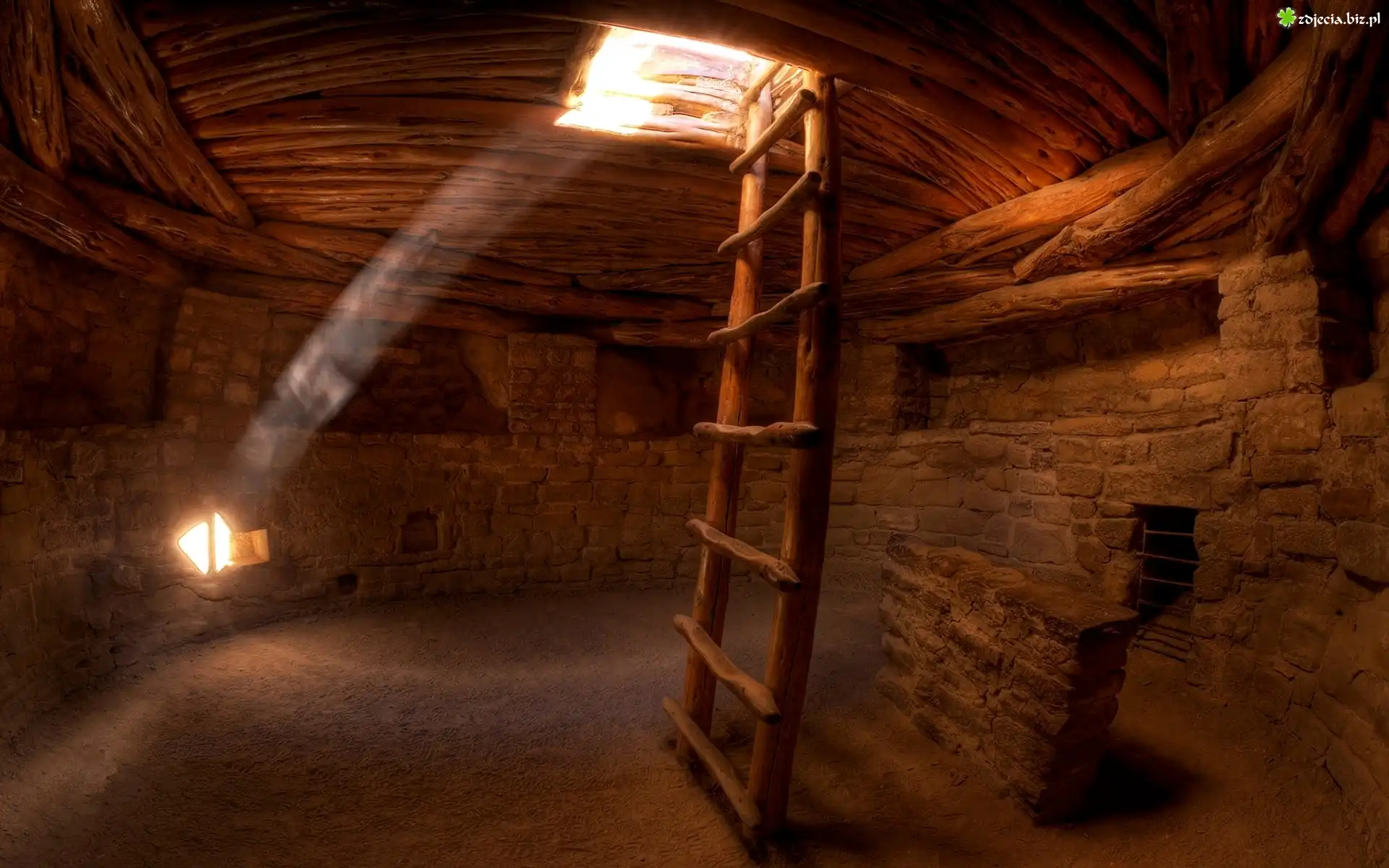 Zdjęcie Wnętrze, Piwnica, Drabina, Ściany, Cegła, Przebijające światło
