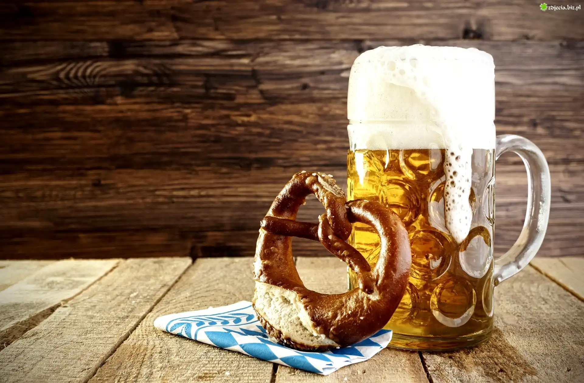 Zdjęcie Piwo, Kufel, Precel, Deski, Serwetka