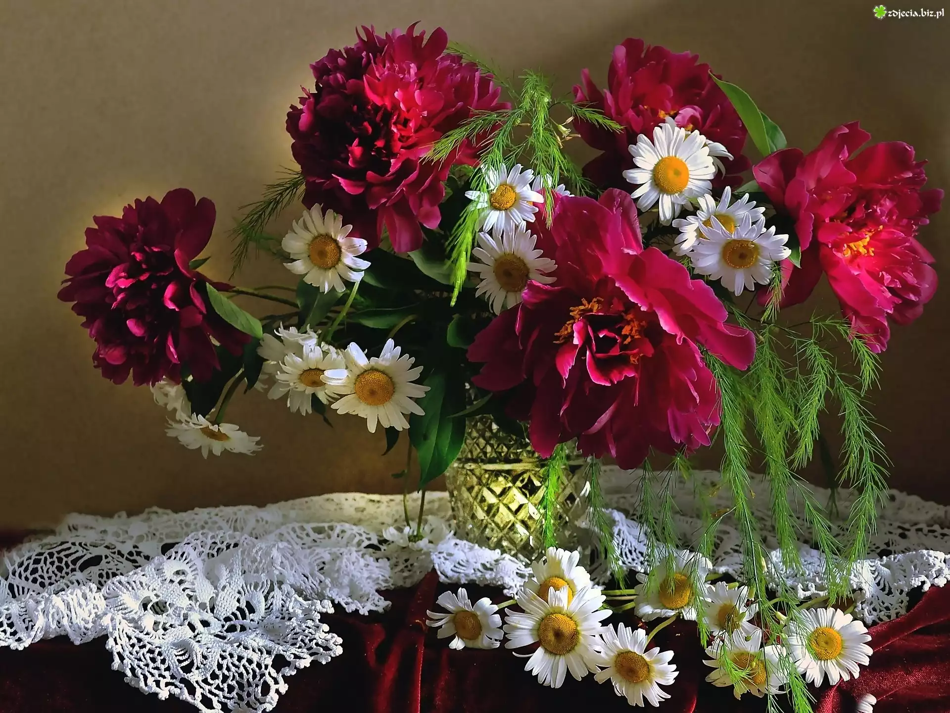 Zdjęcie Piwonie, Flakon, Margerytki, Bukiet
