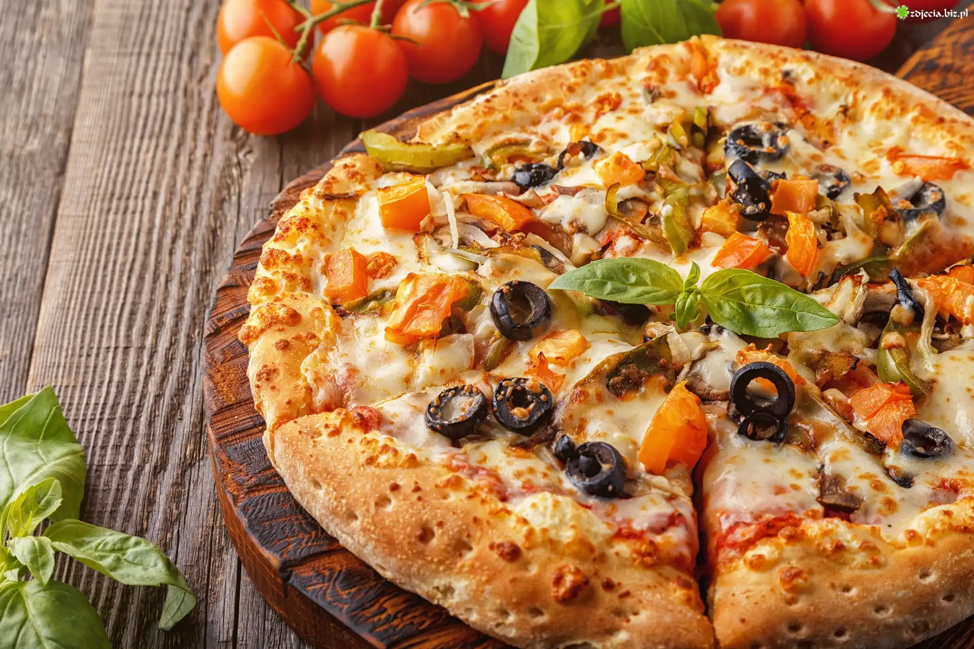 Zdjęcie Pizza, Kawałki, Oliwki, Deska