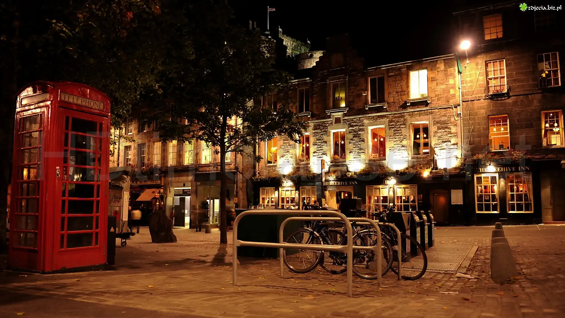 Zdjęcie Domy, Plac, Rowery, Budka, Telefoniczna, Fragment, Miasta, Nocą