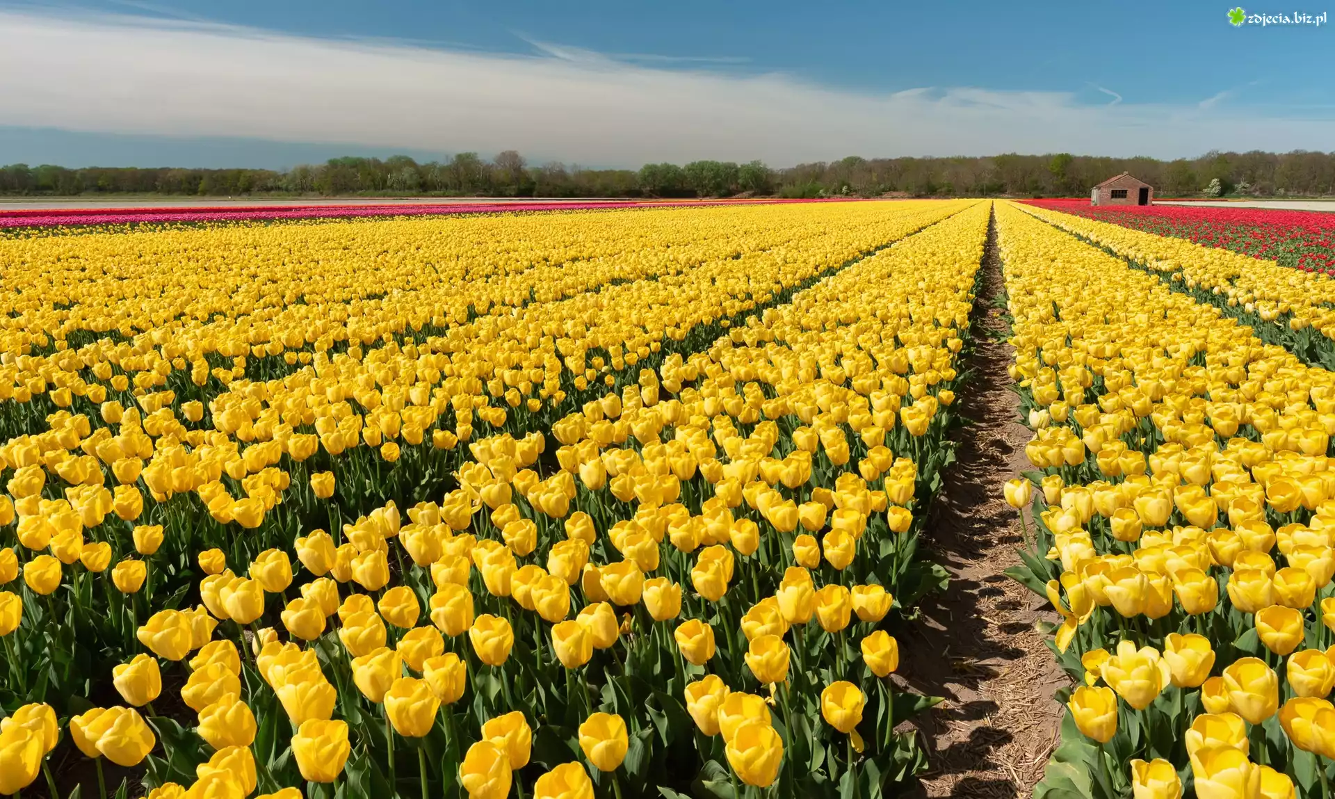 Zdjęcie Pole, Plantacja, Żółte, Tulipany, Drzewa