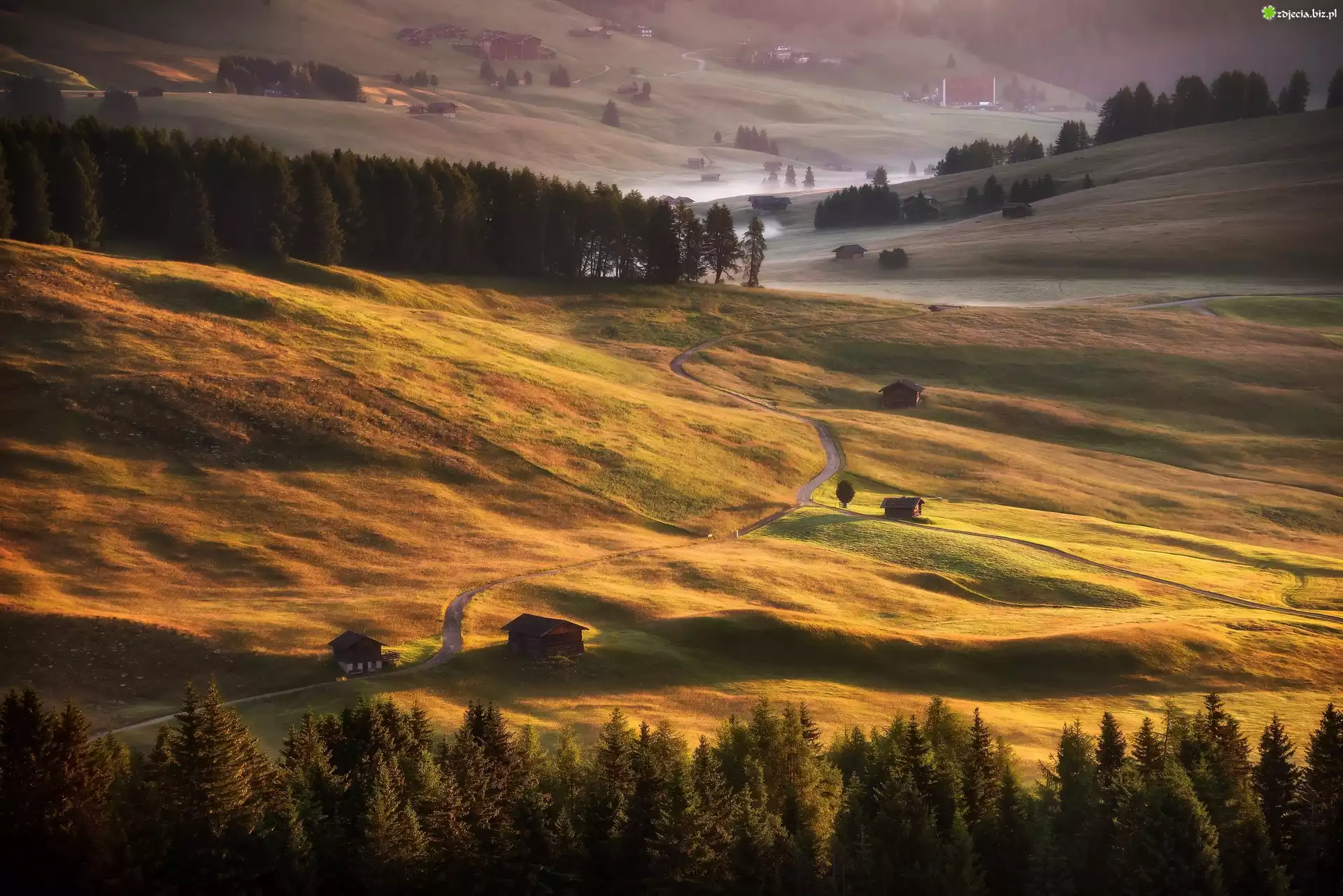 Zdjęcie Płaskowyż Seiser Alm, Wzgórza, Pola, Drzewa, Droga, Domy, Dolina, Mgła, Region Trydent-Górna Adyga, Włochy |