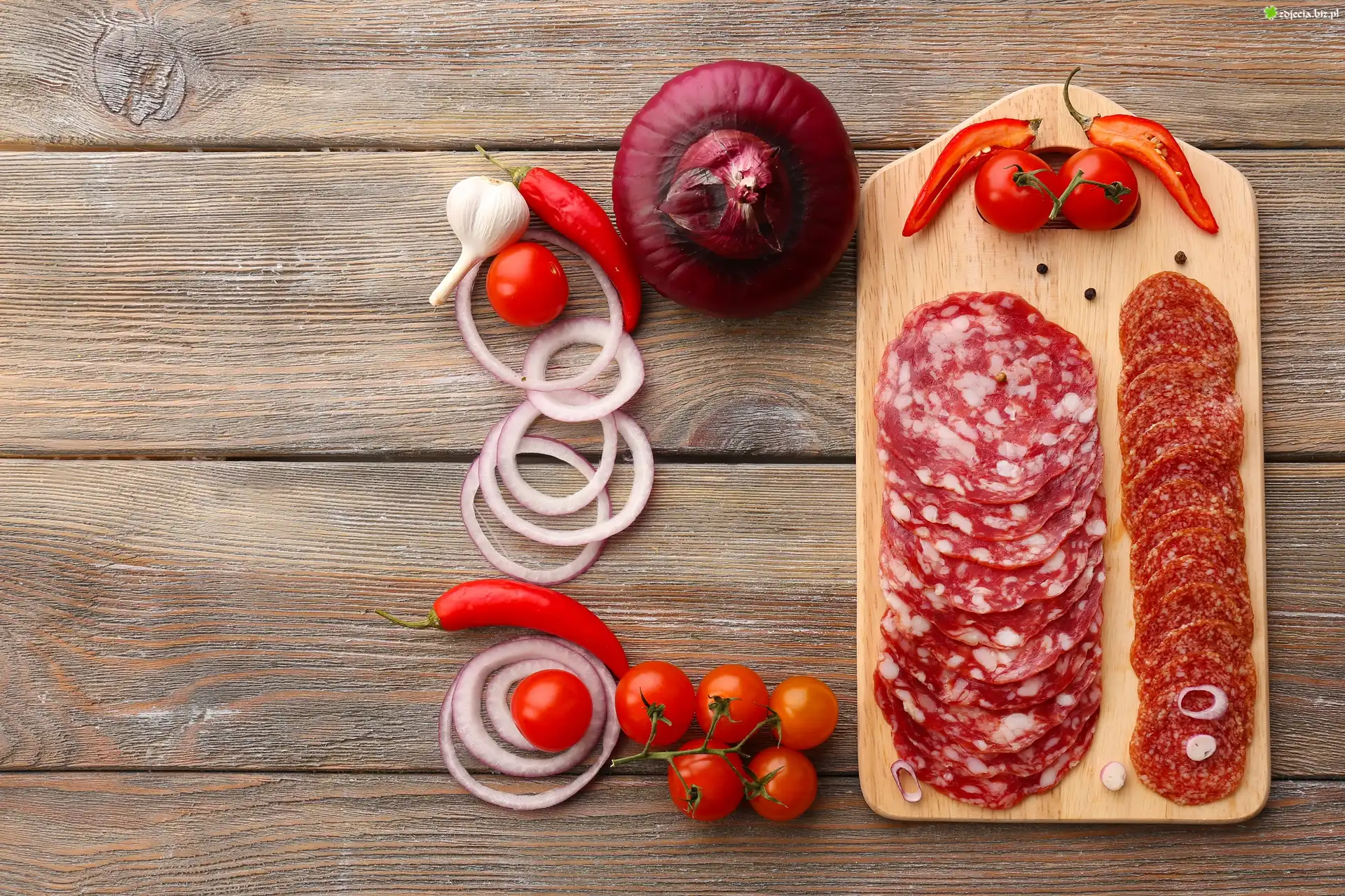 Zdjęcie Salami, Plasterki, Deska, Papryczki, Pomidorki, Cebula, Czosnek