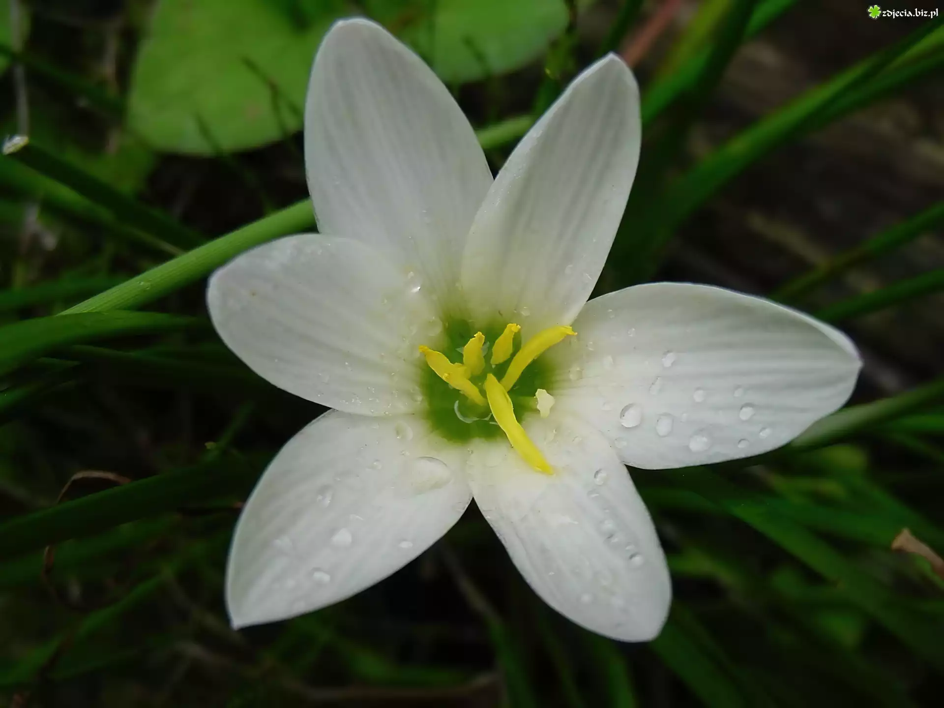 Zielone, Suche, Łodygi Żółte, Zefiranty Dwa, Różowe, Kwiaty, Zefiranty, Zephyranthes Śliczny, Kwiat Dwa, Śliczne, Kwiatki Różowe, Rozkwitnięte, Kwiaty, Zefiranty Białe, Płatki, Krople Fioletowy, Zefirant Białe, Płatki