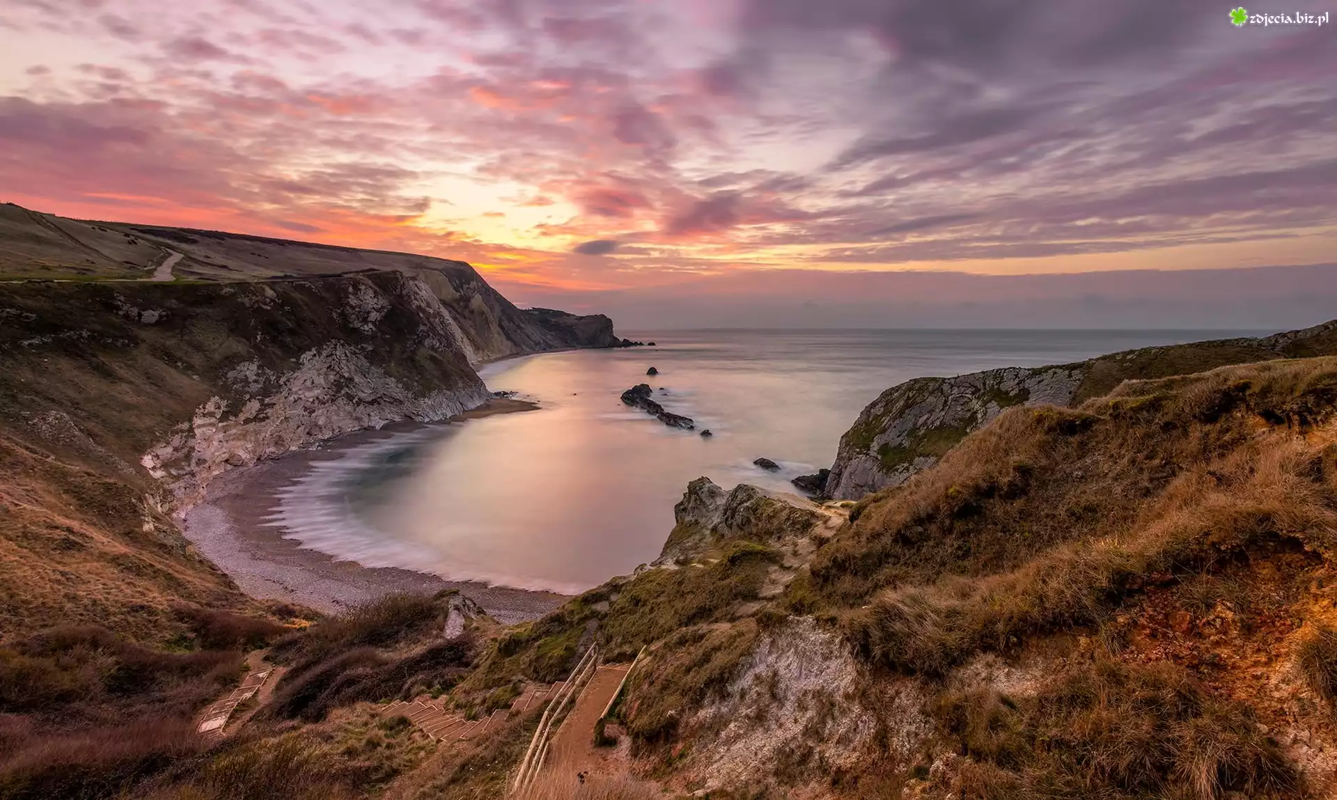 Zdjęcie Morze, Wybrzeże, Zatoka, Plaża, Man OWar Beach, Zachód słońca, Chmury, Hrabstwo Dorset, Anglia |