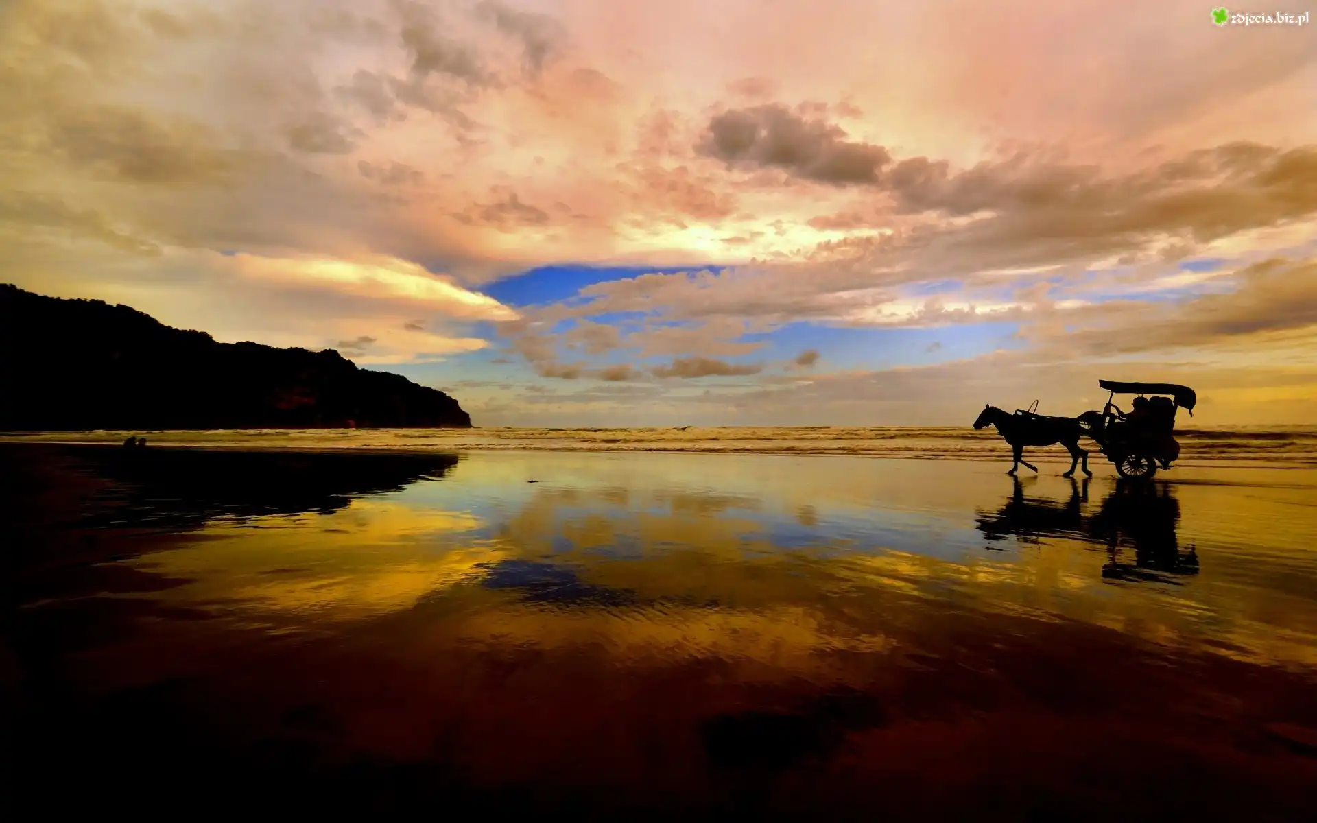 Zdjęcie Plaża, Zachód, Słońca, Koń, Wózek