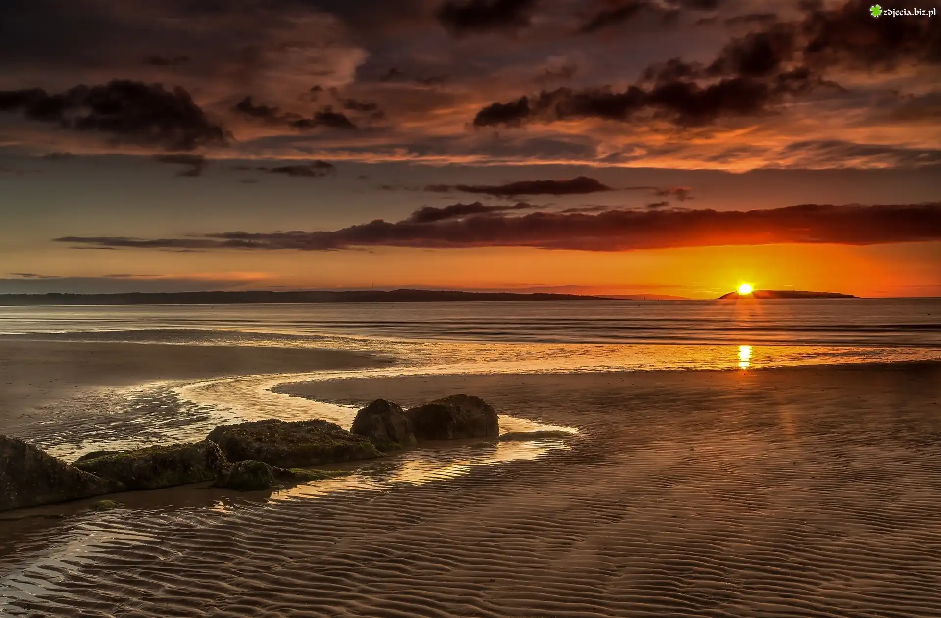 Zdjęcie Morze, Plaża, Zachód Słońca, Niebo, Chmury, Kamienie