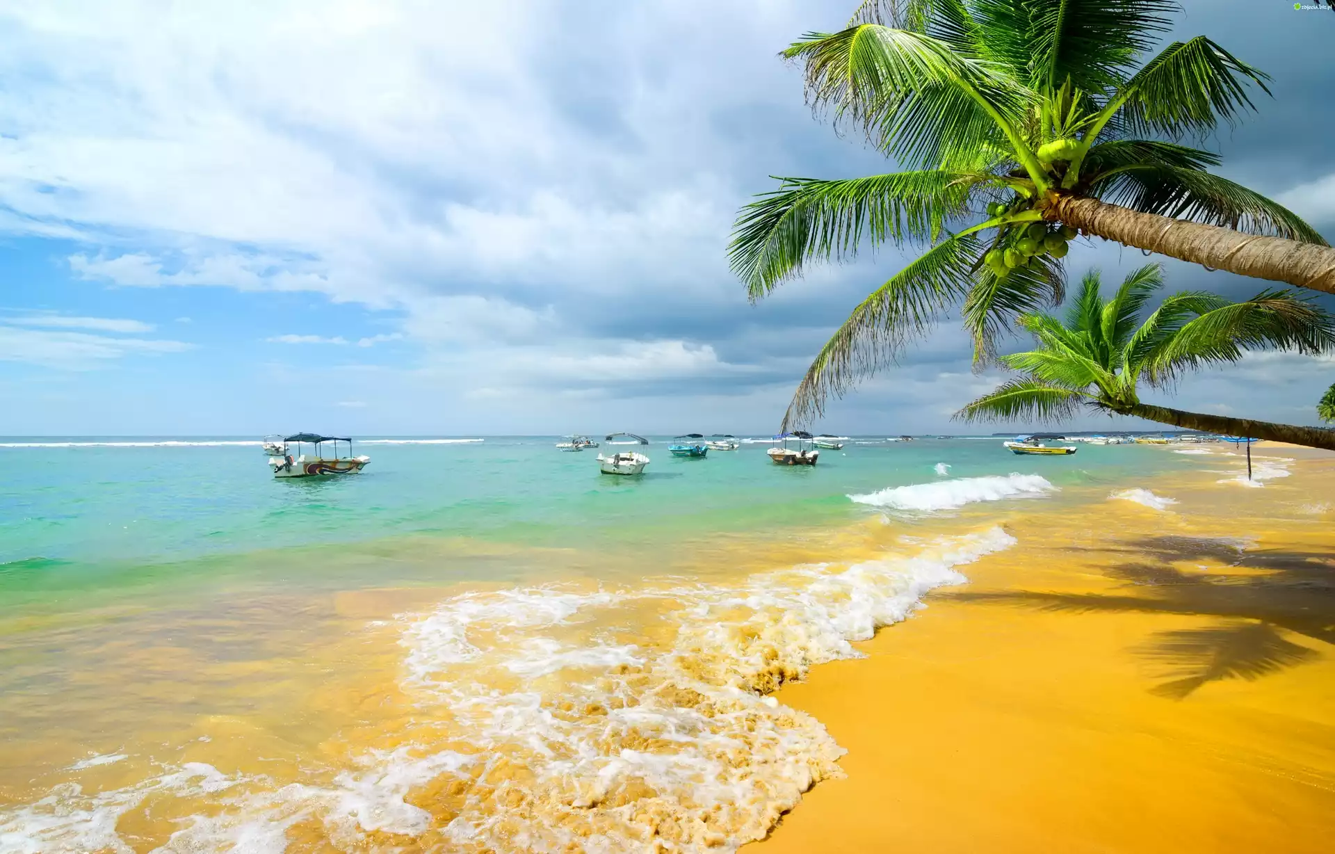 Zdjęcie Morze, Plaża, Fale, Palmy, Łódki, Tropikalny Raj
