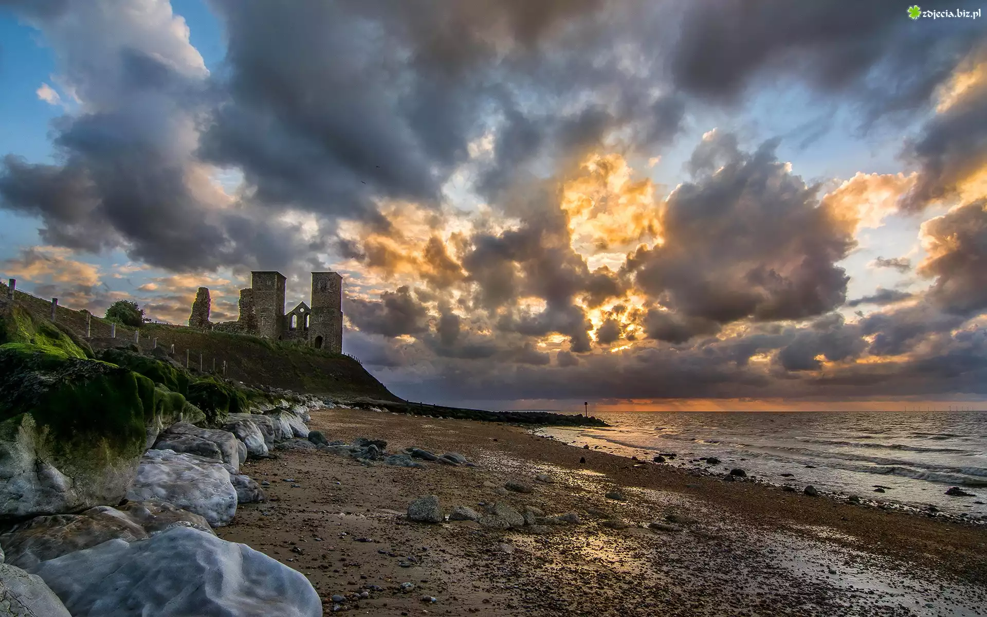 Zdjęcie Morze, Plaża, Kamienie, Ruiny, Chmury, Zachód, Słońca