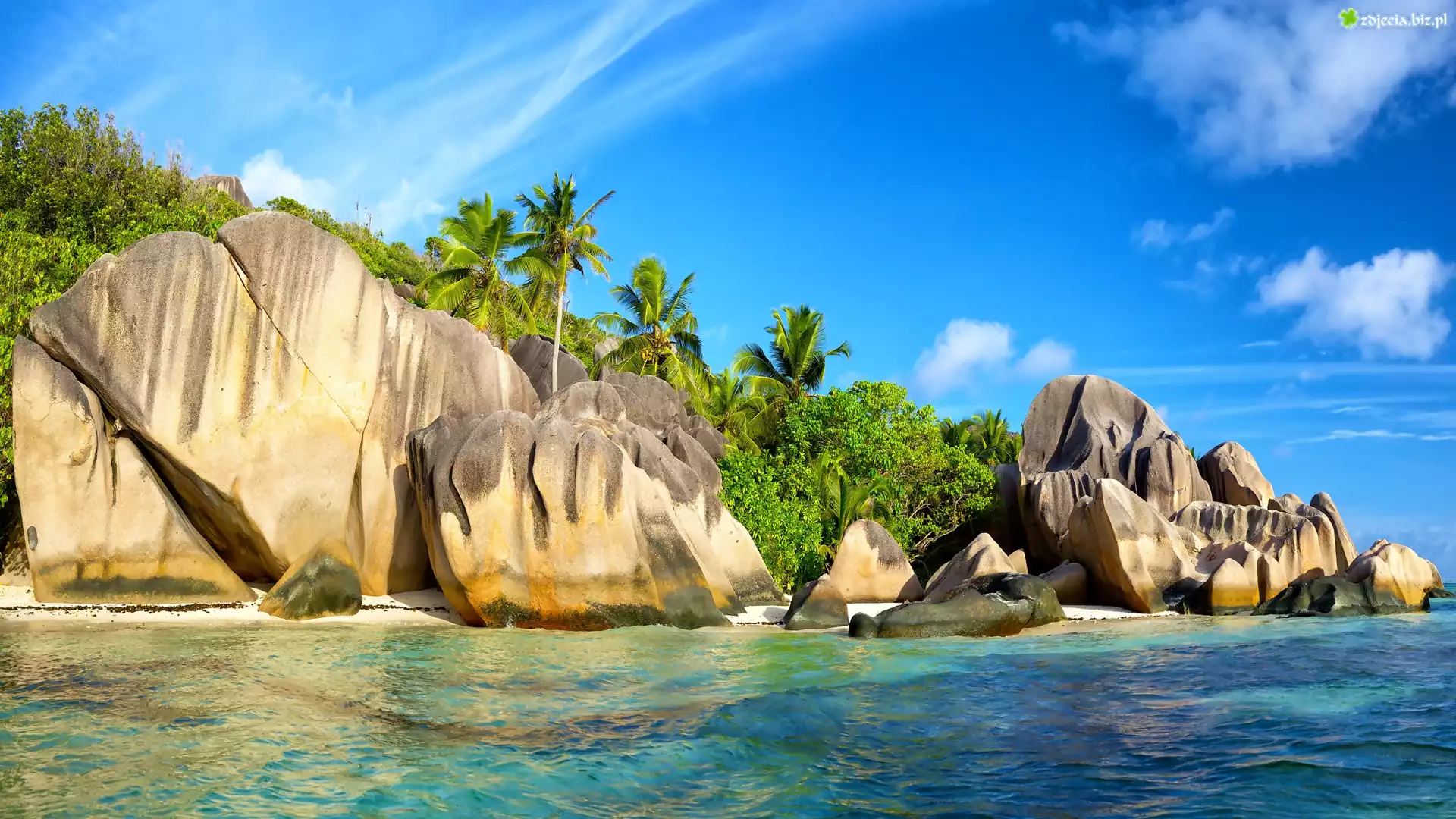 Zdjęcie Seszele, Wyspa La Digue, Plaża Anse Source d Argent, Morze, Skały, Głazy, Palmy, Roślinność