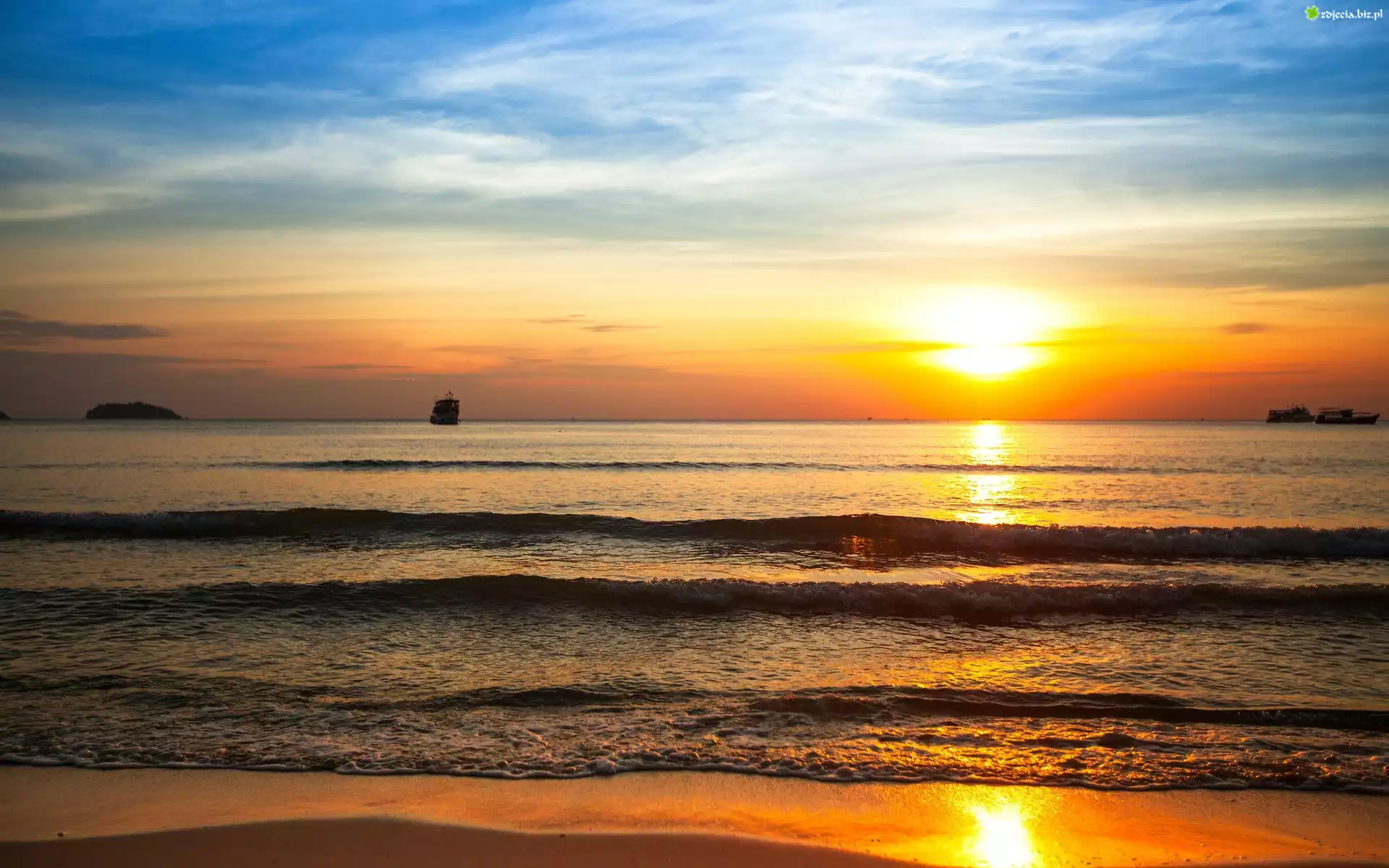Zdjęcie Plaża, Morze, Fale, Statki, Zachód, Słońca