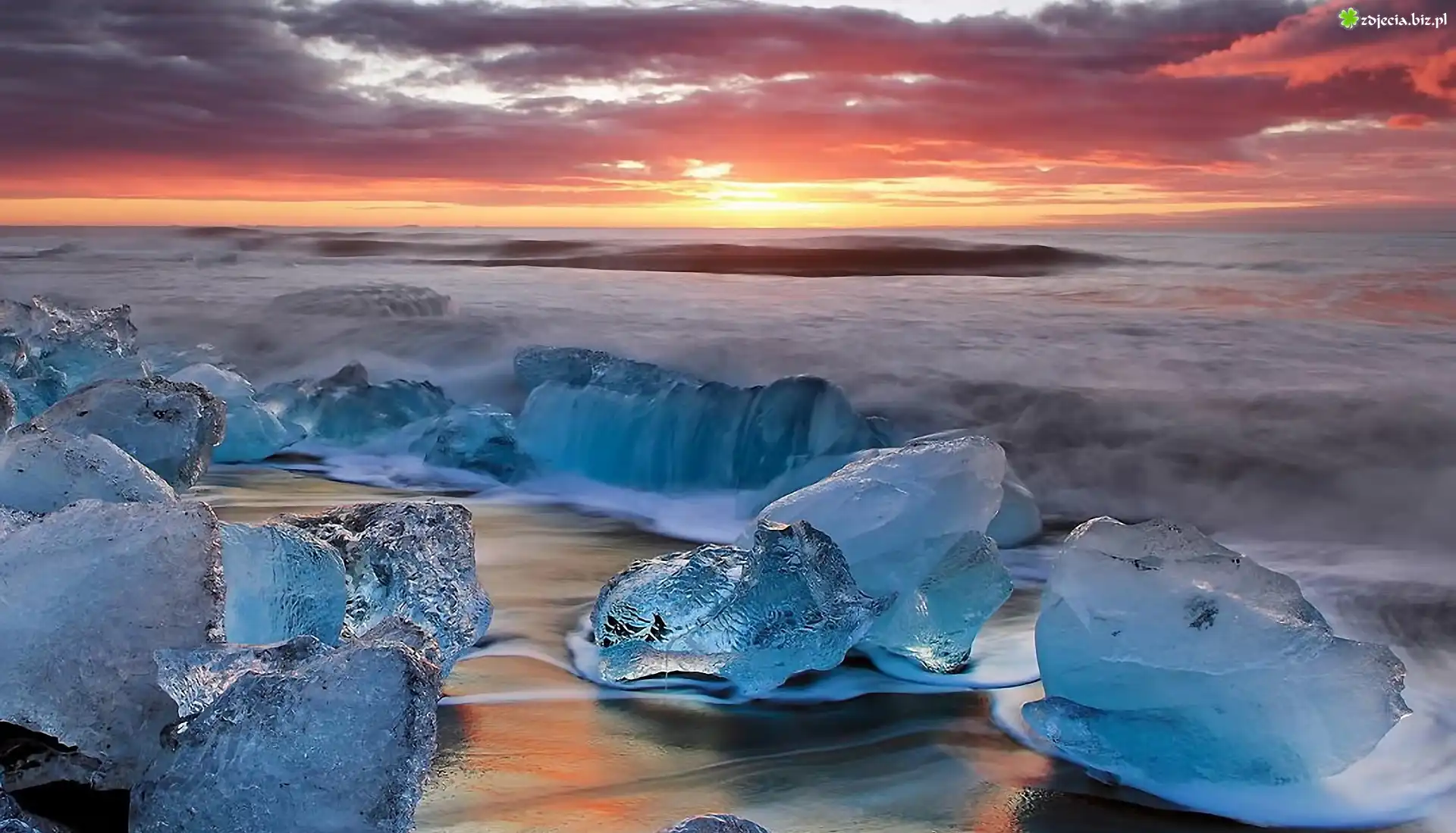 Zdjęcie Plaża, Bryły, Lodu, Zachód, Słońća
