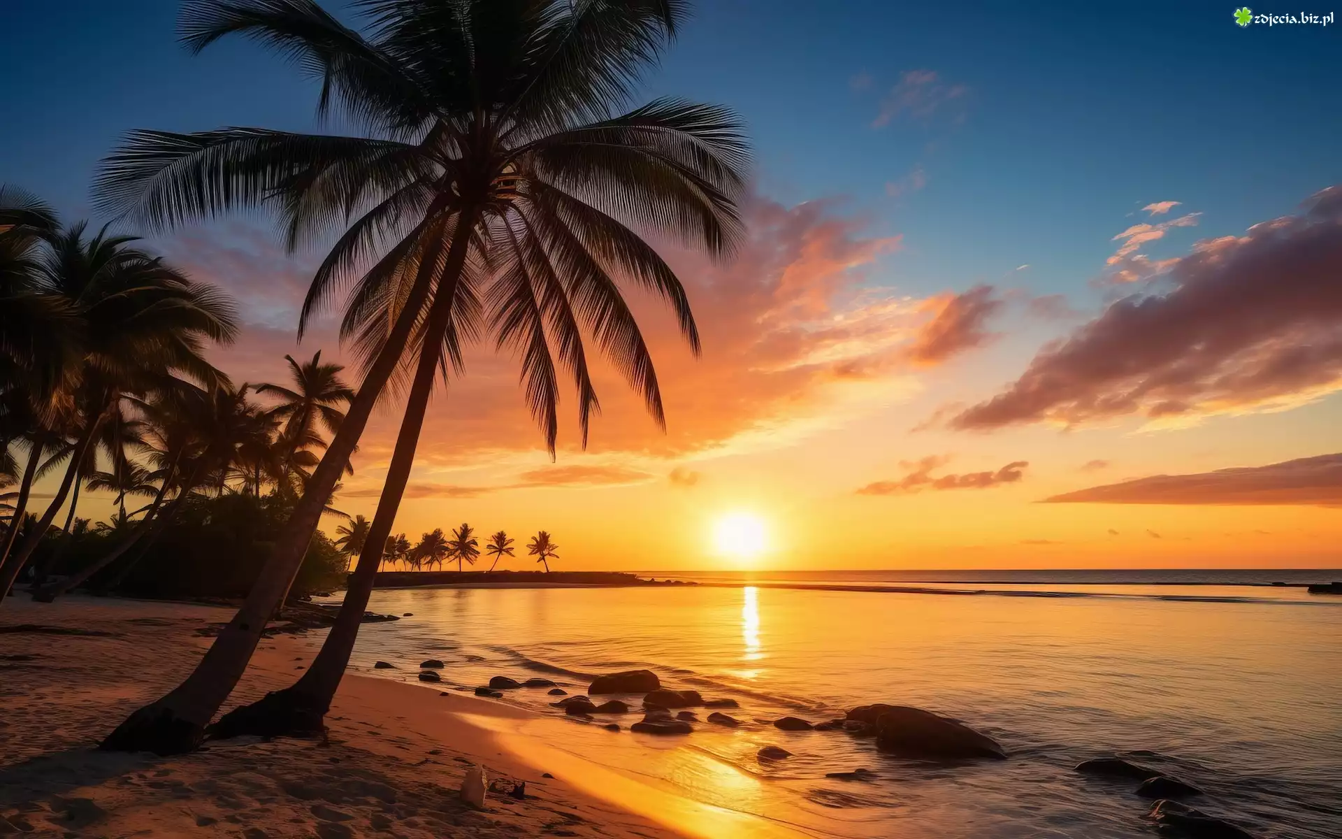 Zdjęcie Morze, Plaża, Zachód słońca, Palmy