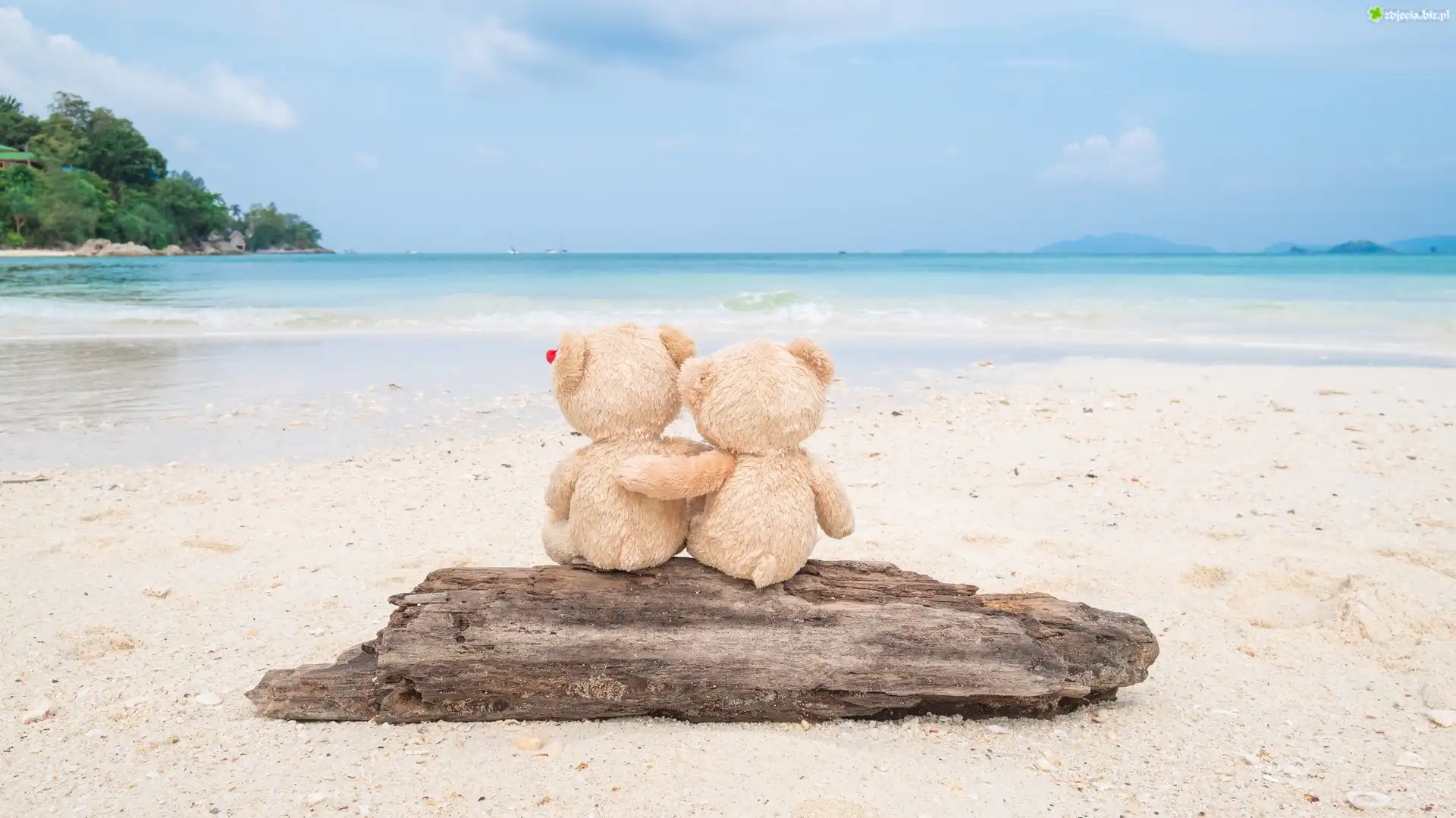 Zdjęcie Pluszowe, Misie, Kłoda, Piasek, Plaża