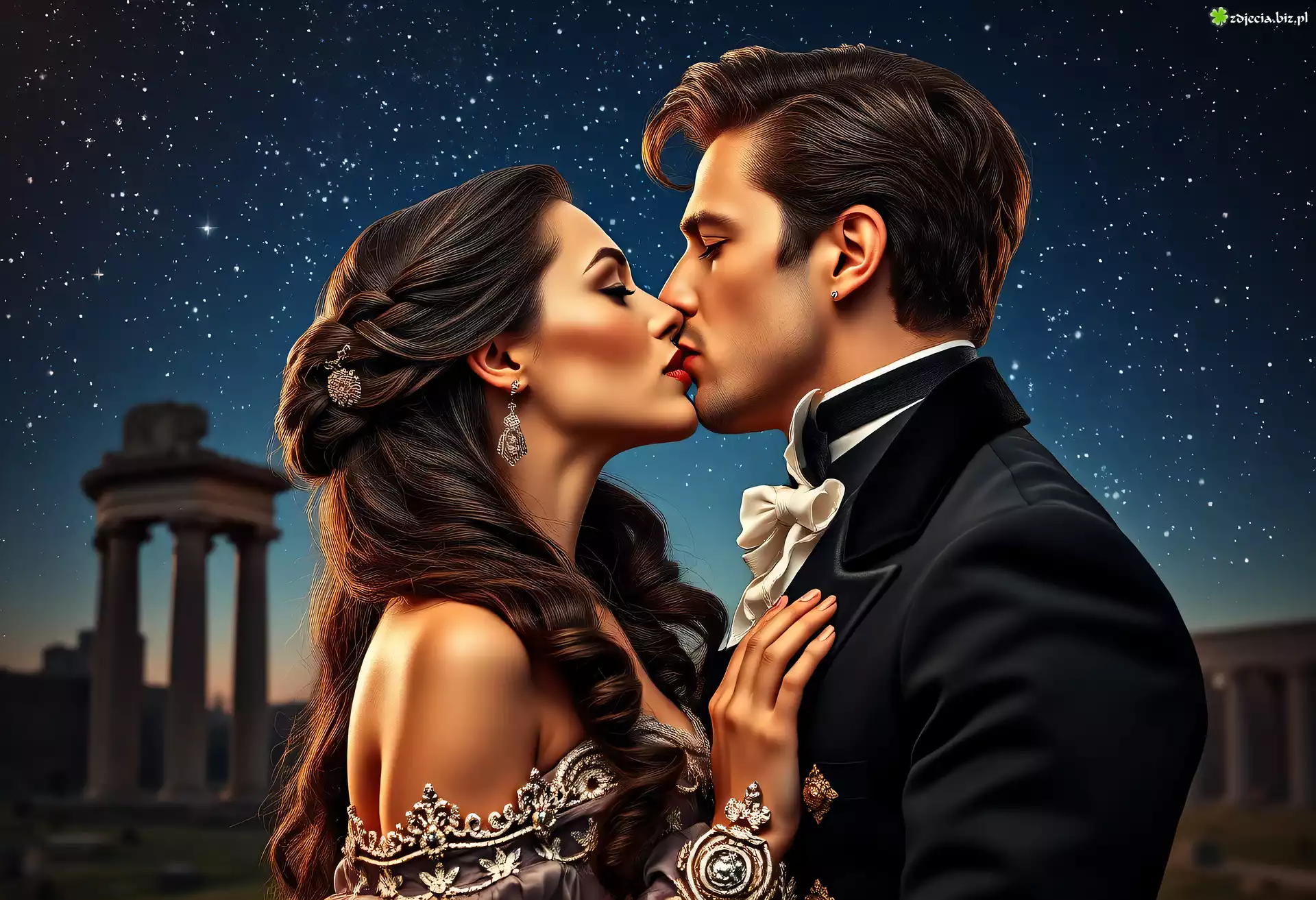 Zdjęcie Kobieta, Mężczyzna, Zakochani, Pocałunek, Miłość, Niebo, Gwiazdy