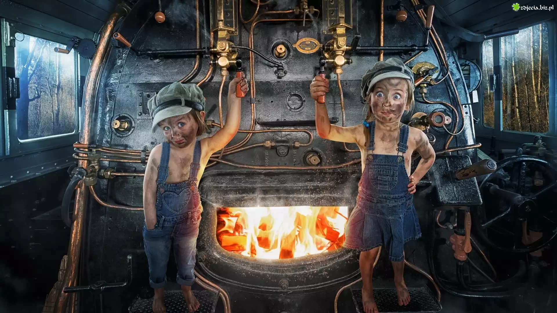 Zdjęcie Pociąg, Lokomotywa, Palenisko, Ogień, Dzieci, Maszynistki