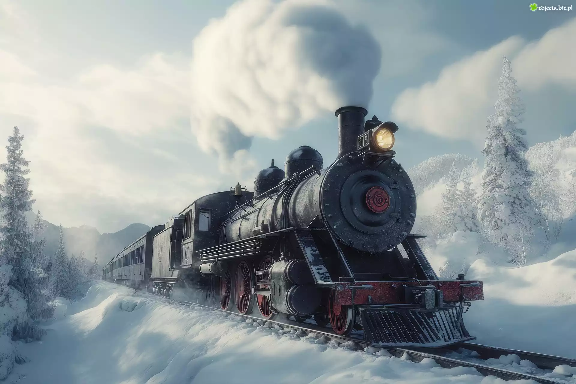 Zdjęcie Zima, Pociąg, Parowy, Tory, Drzewa