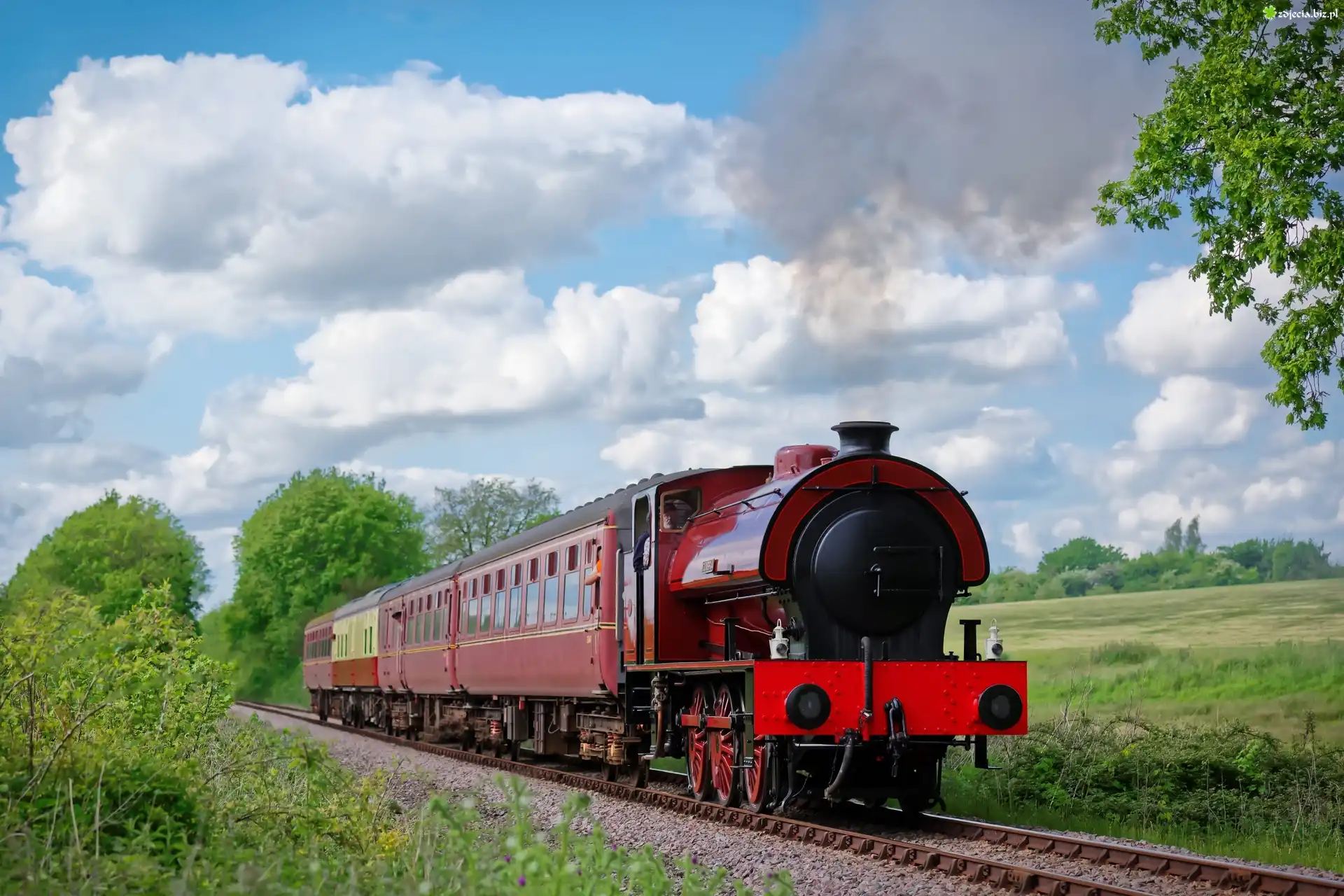 Zdjęcie Pociąg, Wagony, Tory, Pole, Roślinność