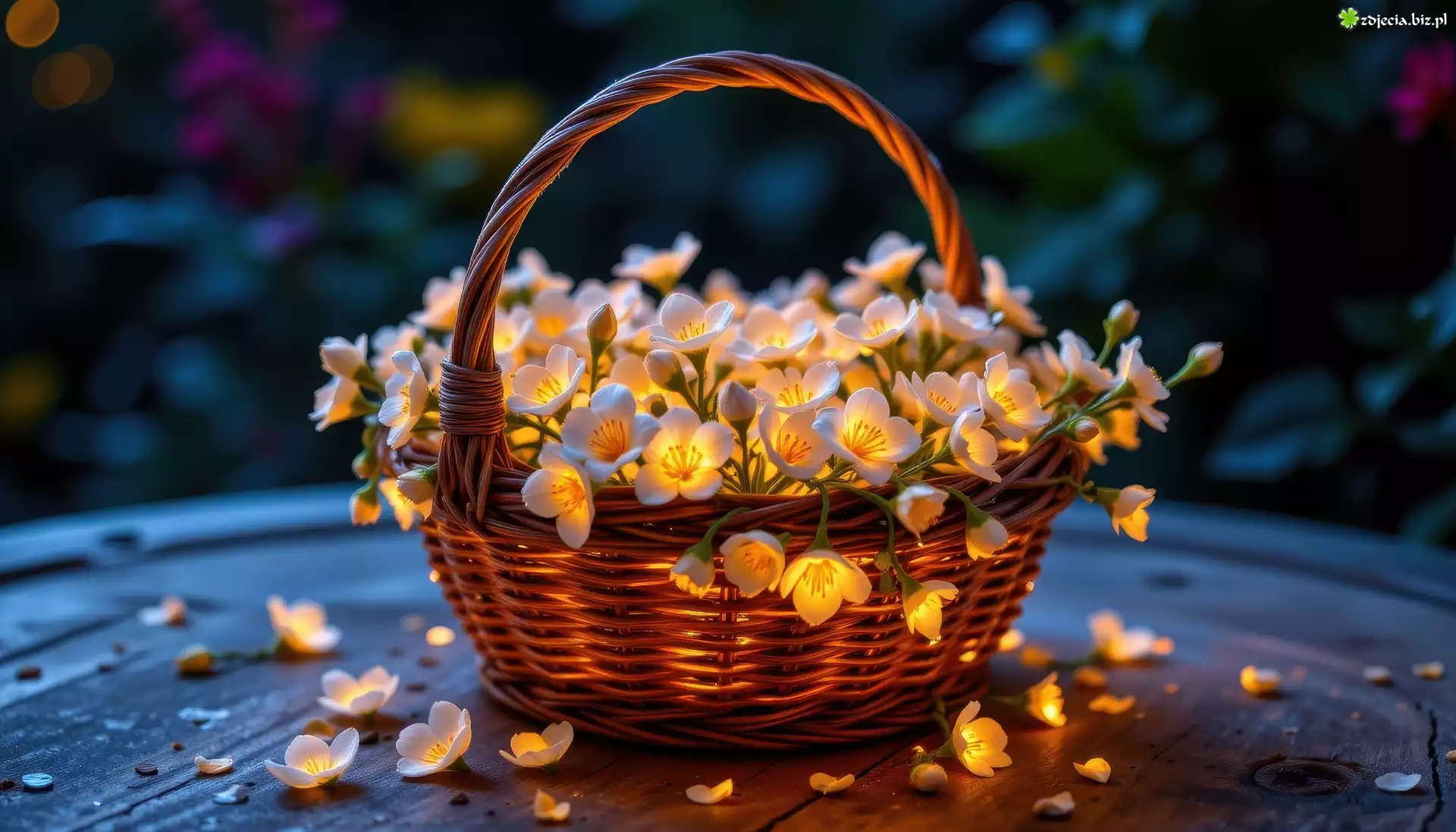 Zdjęcie Kwiaty, Podświetlone, Koszyk, Wiklinowy, AI