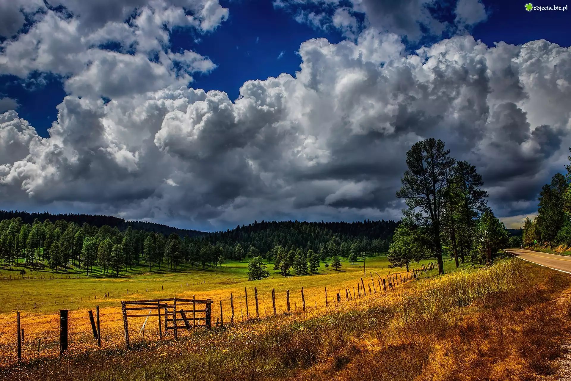 Zdjęcie Pola, Niebo, Ciemne, Chmury, Droga, Drzewa