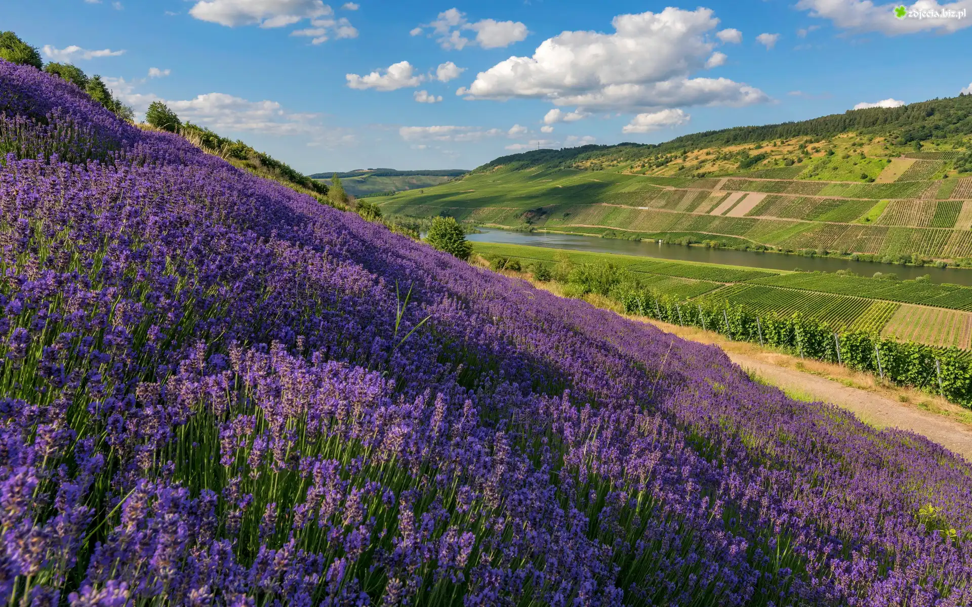 Zdjęcie Wzgórza, Pola, Kwiaty, Lawenda, Dolina, Winnice, Rzeka, Drzewa