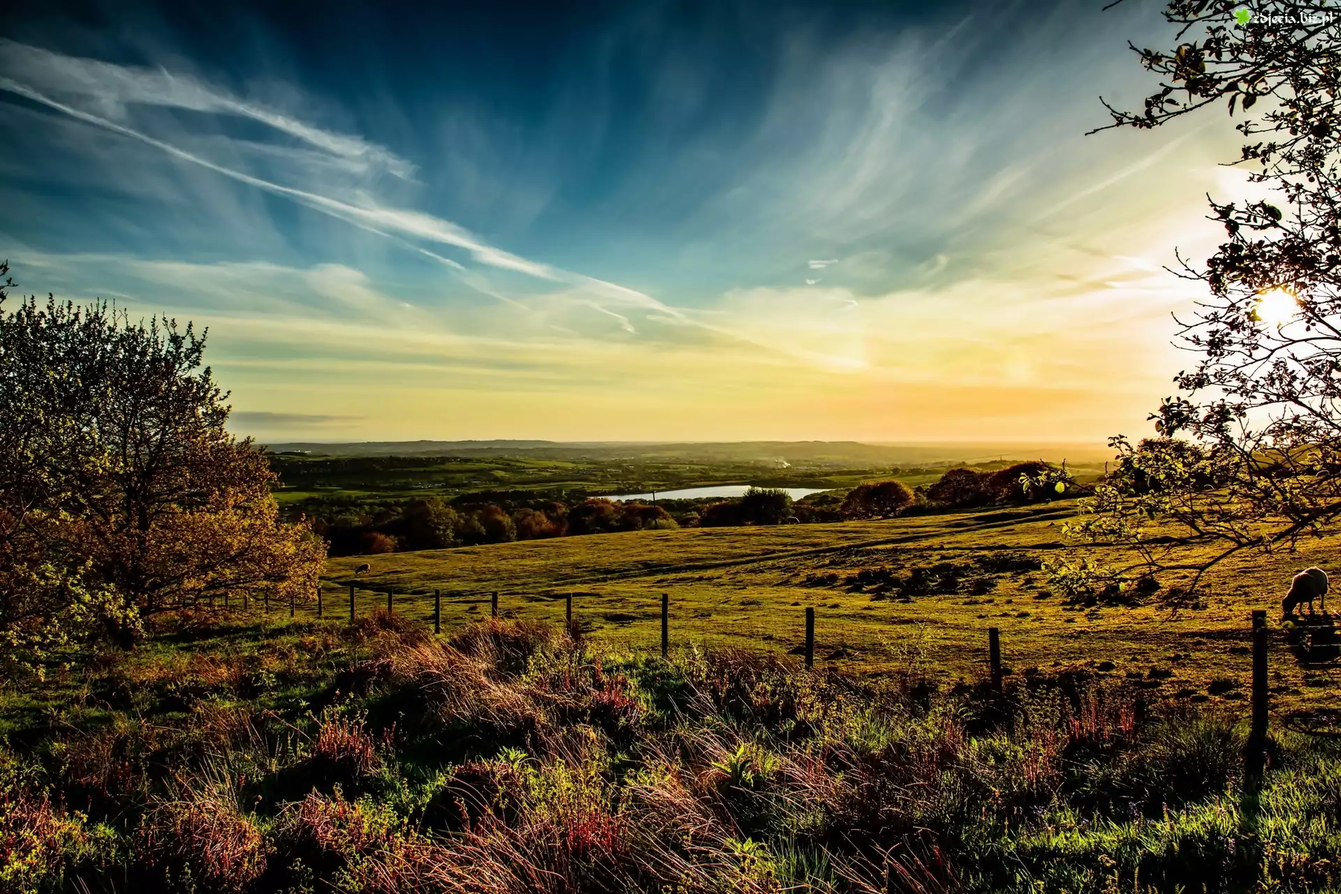 Zdjęcie Pola, Łąki, Drzewa, Jezioro, Chmury