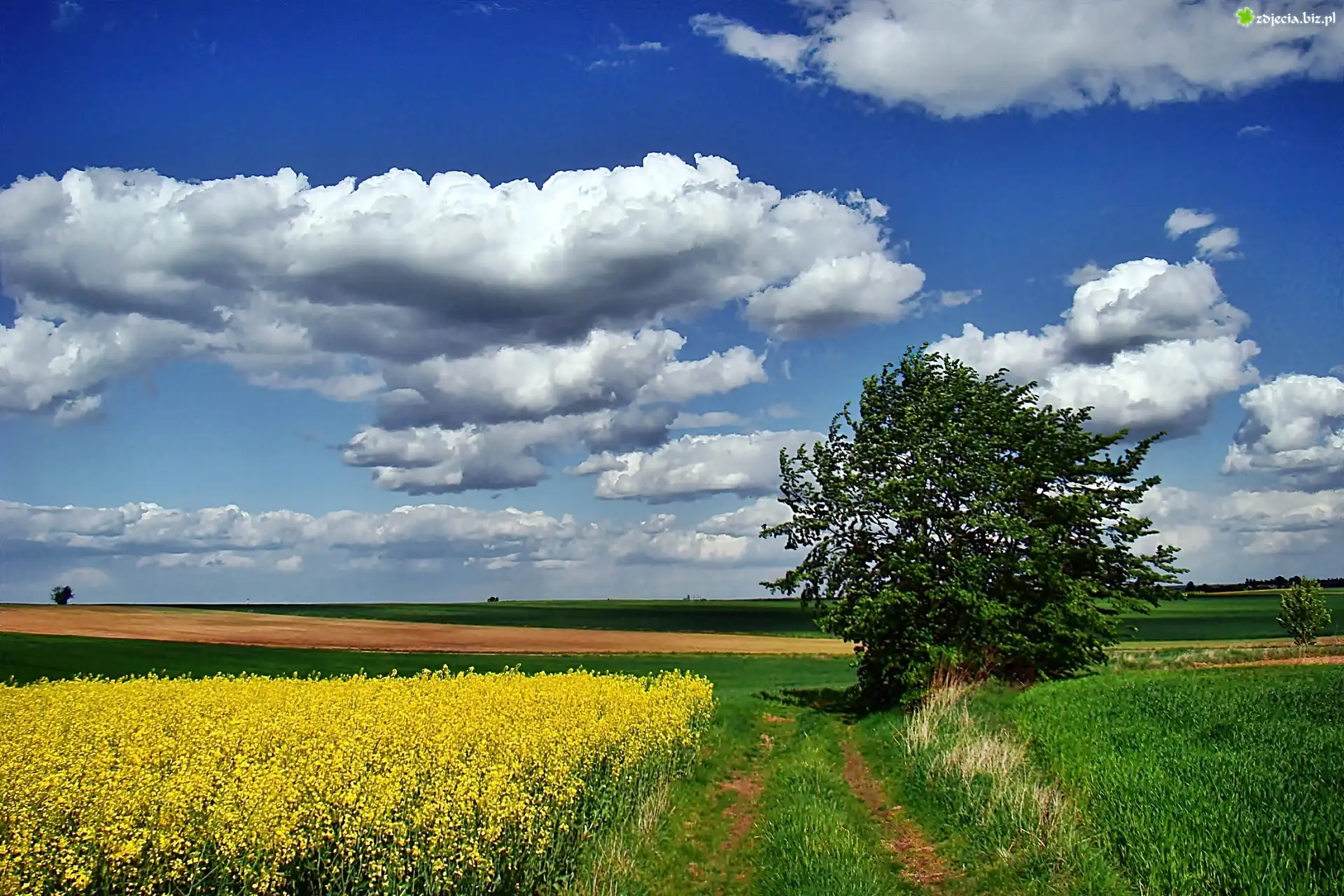 Zdjęcie Pola, Droga, Drzewo, Obłoki, Kwitnący, Łubin