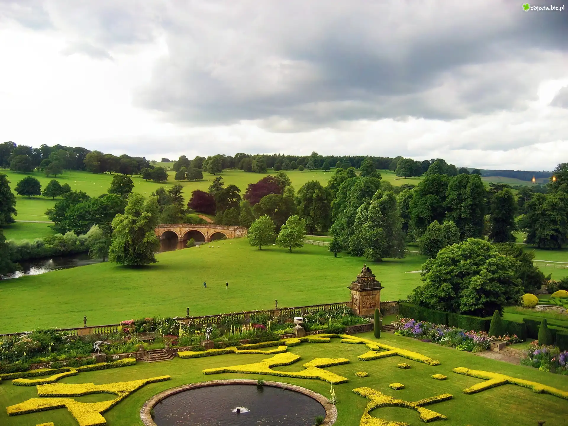 Zdjęcie Pola, Ogrody, Rzeka, Most, Drzewa